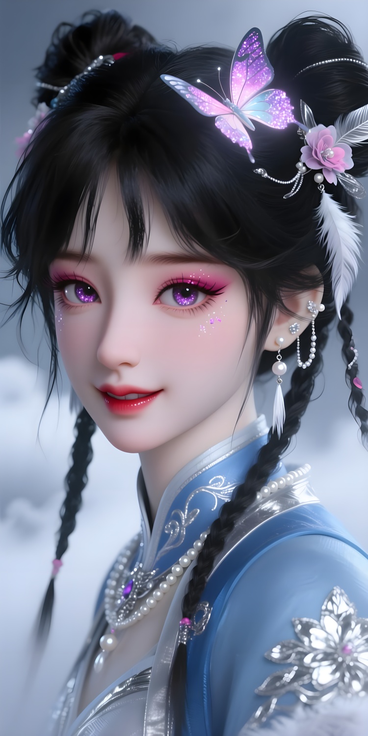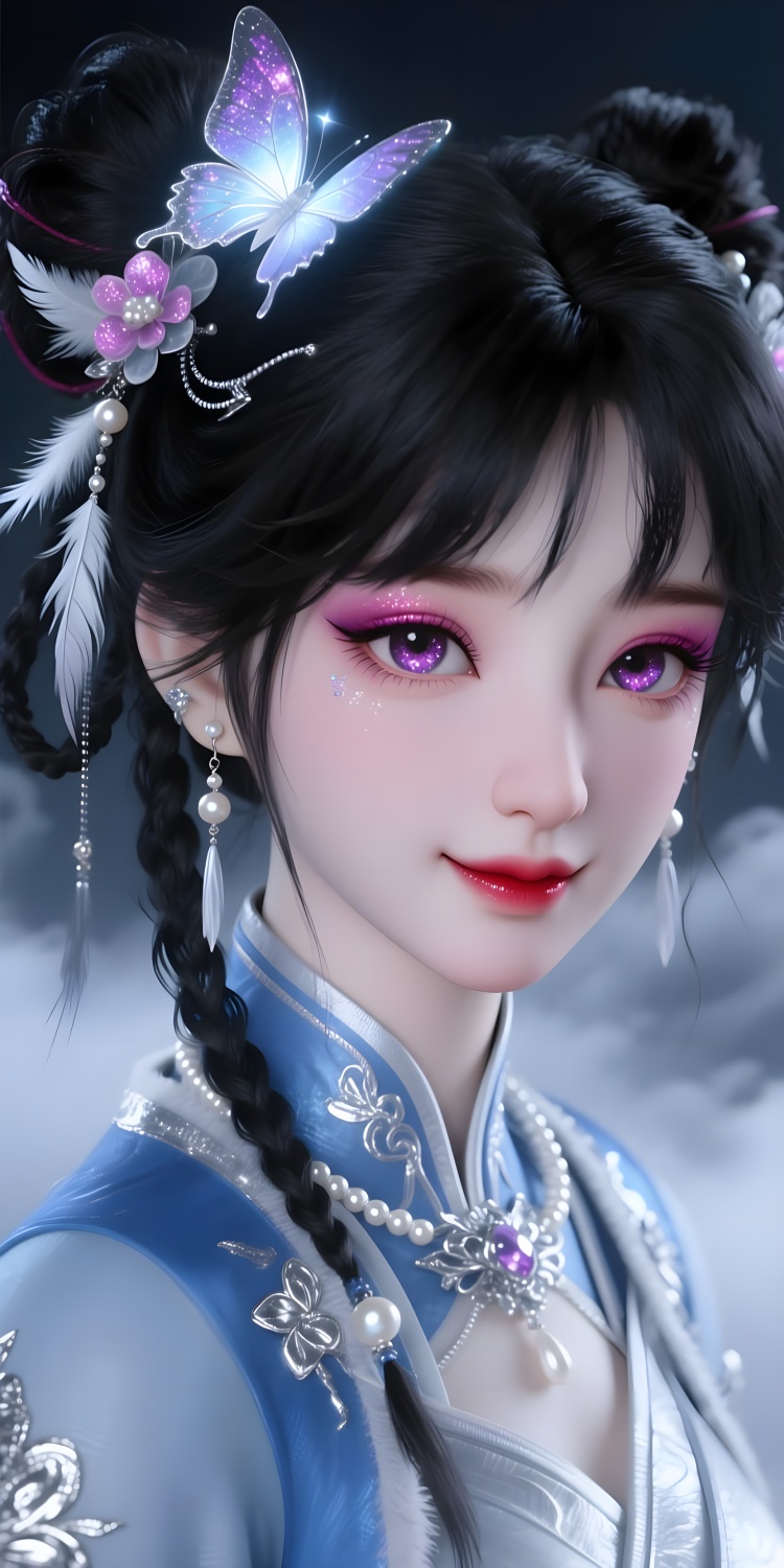 还原提示词:1girl, solo, double bun, jewelry, earrings, black hair,hair ornament, braid, chinese clothes,realistic, pom pom (clothes),black eyes, fur trim, long sleeves, wide sleeves,dress, brown eyes, bangs, tassel, hair flower,sash,