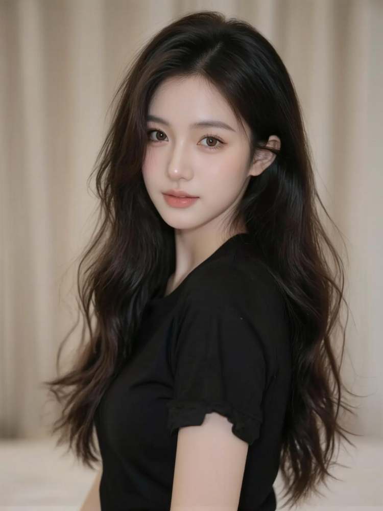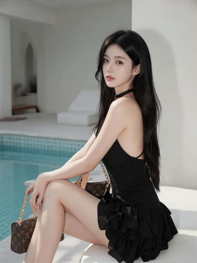 a photo-realistic shoot from a side camera angle about a woman posing with a city skyline at night in the background, the image also shows a woman with long black hair, wearing a white **** top and a high-waisted denim skirt, standing in the middle of the image with her back to the camera, looking over her shoulder with a confident smile, she appears to be a young *****, with fair skin and a slender physique, she is wearing silver hoop earrings and a silver bracelet on her right wrist, her hair is styled in a long, flowing manner, and she has a mole on her left shoulder, her eyes are looking directly at the viewer, and her expression is a smile, the background features a cityscape at night with a red tower in the distance, and the sky is filled with dark clouds,