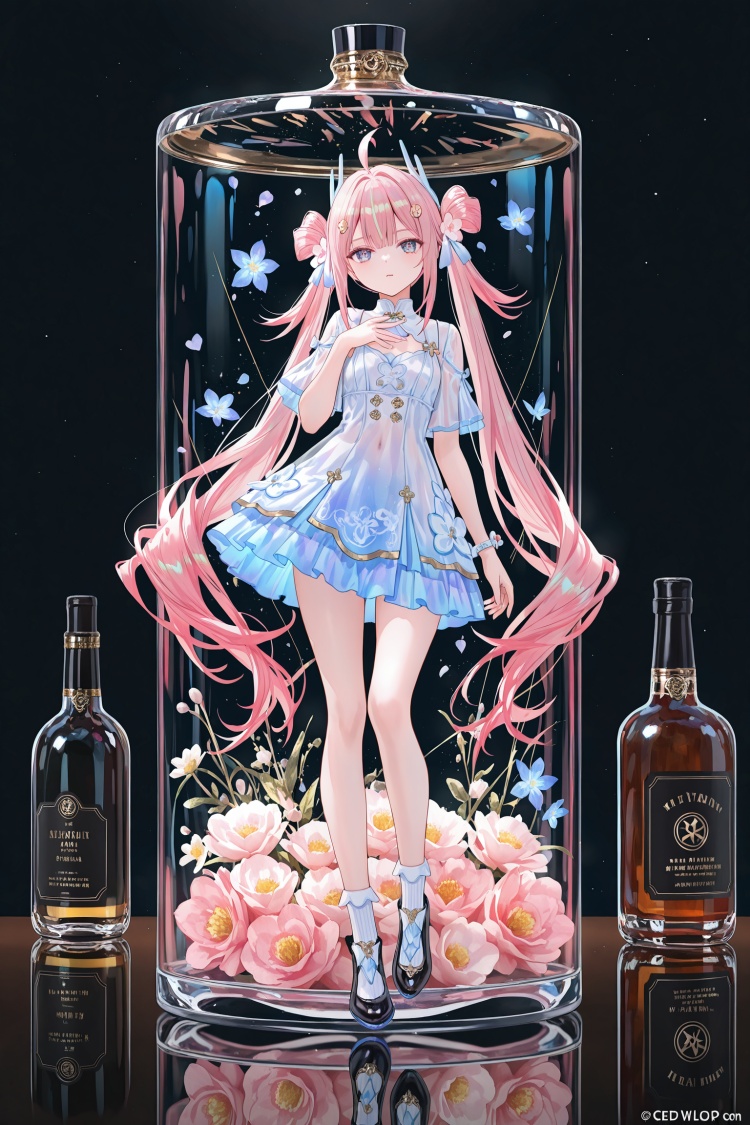 youyun,clothes: youyundef short dress,youyundef hair ornament,1girl,pink hair,very long hair,ahoge,twintails,socks,hair flower