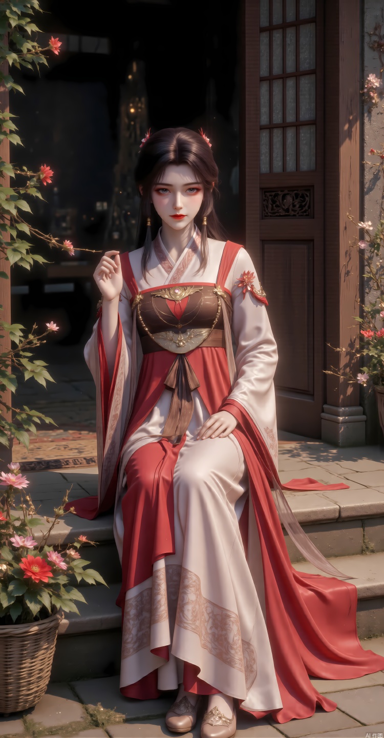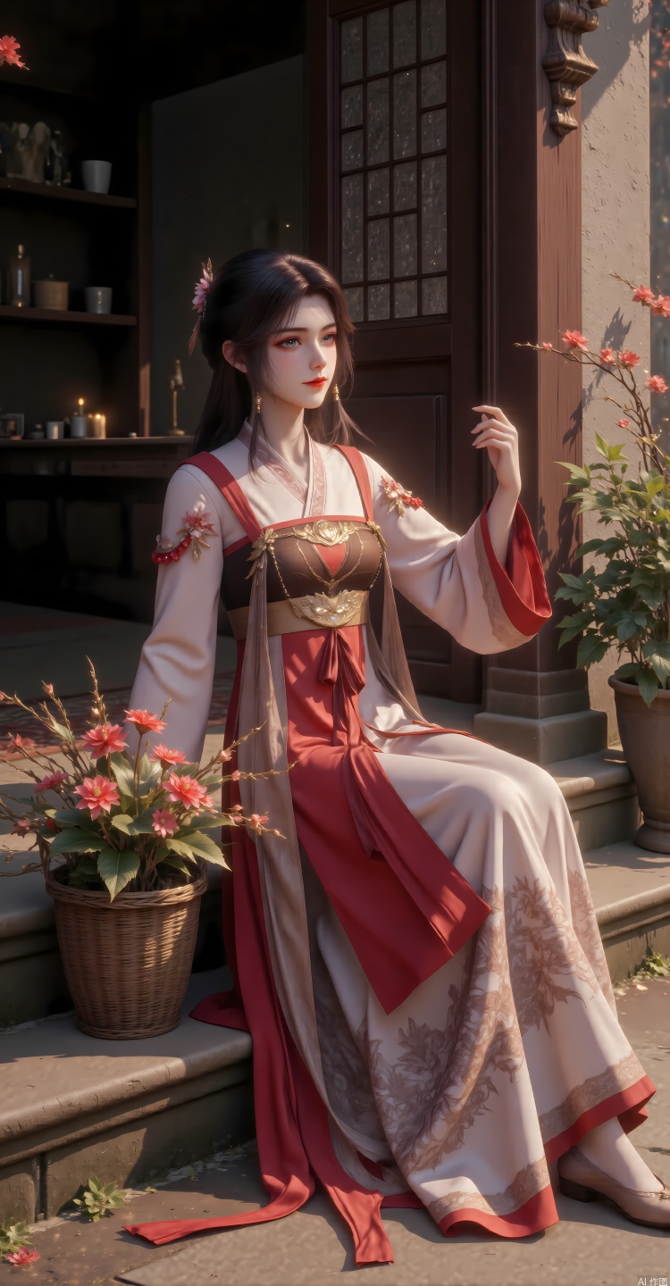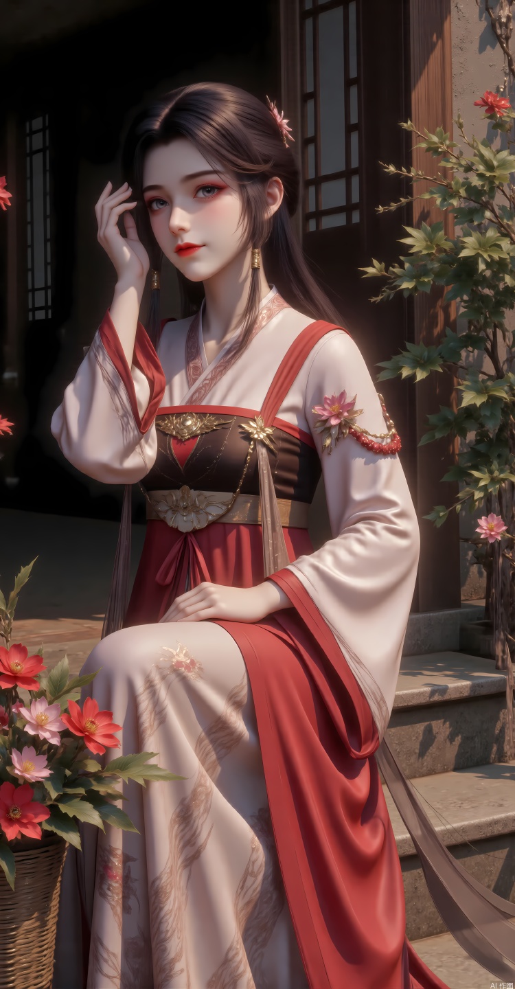 score_9_up,score_8_up,score_7_up,1girl,solo,long hair,looking at viewer,blue eyes,brown hair,hair ornament,jewelry,closed mouth,upper body,flower,earrings,sky,day,shiny,hair flower,shiny hair,red lips