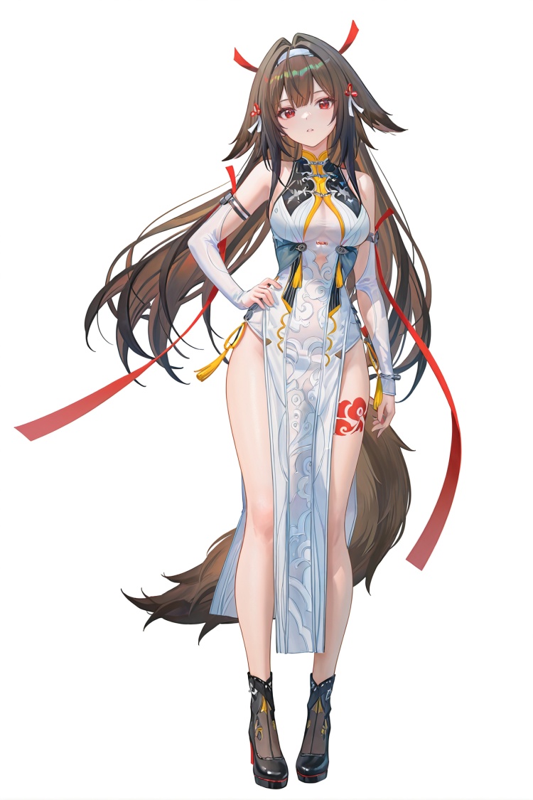 Ye Shunguang \(Zenless Zone Zero\), brown hair, brown animal ears,brown fox tail, a red left thigh band tattoo, clothes: guang white def china dress, guang def white hairband, guang detached sleeves, red hair ribbons, 1girl, long hair, breasts,red eyes,streaked hair,