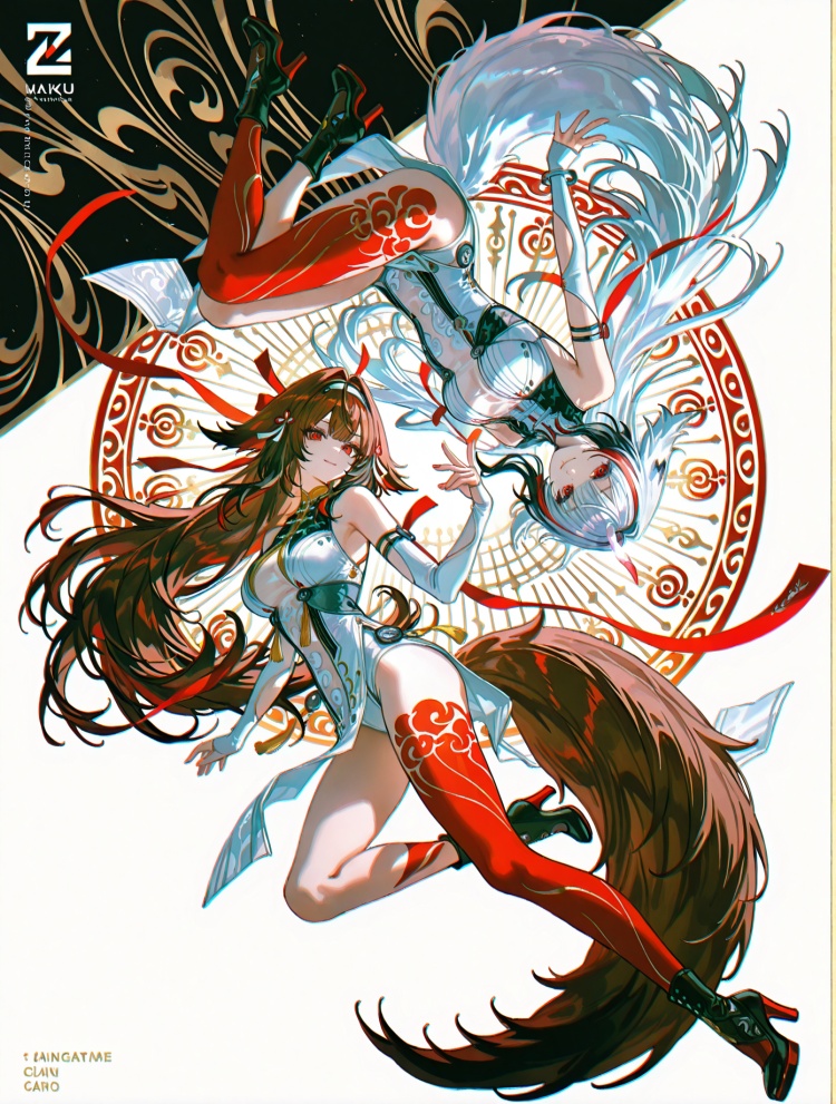 黑发原皮 Ye Shunguang \(Zenless Zone Zero\), brown hair, brown animal ears,brown fox tail, a red left thigh band tattoo, clothes: guang white def china dress, guang def white hairband, guang detached sleeves, red hair ribbons, 1girl, long hair, breasts,red eyes,streaked hair, 白发原皮 Ye Shunguang \(Zenless Zone Zero\), albino state, grey hair, grey animal ears, white fox tail, asymmetric red leg tattoos, extensive red left leg tattoo, single see-through horn, clothes: guang white def china dress, guang def white hairband, guang detached sleeves, red hair ribbons, 1girl, long hair, breasts, red eyes, red hair, multicolored hair, high heels, streaked hair, 黑发皮肤 Ye Shunguang \(Zenless Zone Zero\), brown hair, brown animal ears, brown tail,a red left thigh band tattoo, clothes: guang pink skirt, guang white corset-style top, guang white detached armlets, red wrapping ribbons, guang white and pink hairband, red hair ribbons, 1girl, long hair, breasts, smile, red eyes, red footwear,guang red small crossbody bag,high heels, 白发皮肤 Ye Shunguang \(Zenless Zone Zero\), albino state, grey hair, grey animal ears, grey tail,asymmetric red leg tattoos, extensive red left leg tattoo, single see-through horn, clothes: guang pink skirt, guang white corset-style top, guang white detached armlets, red wrapping ribbons, guang white and pink hairband, red hair ribbons, 1girl, long hair, red eyes, red footwear,guang red small crossbody bag,high heels, 多人 2girls, 1girl and 1boy