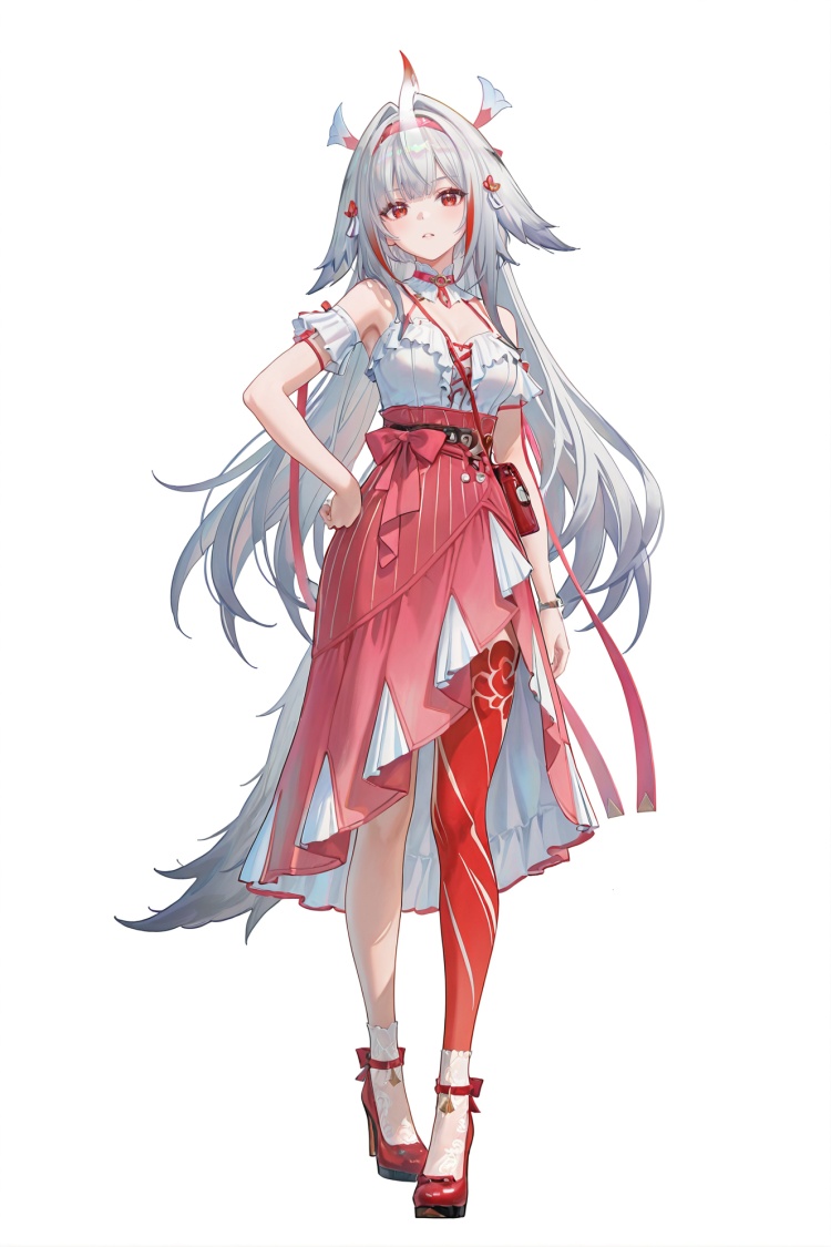 Ye Shunguang \(Zenless Zone Zero\), albino state, grey hair, grey animal ears, grey tail,asymmetric red leg tattoos, extensive red left leg tattoo, single see-through horn, clothes: guang pink skirt, guang white corset-style top, guang white detached armlets, red wrapping ribbons, guang white and pink hairband, red hair ribbons, 1girl, long hair, red eyes, red footwear,guang red small crossbody bag,high heels,