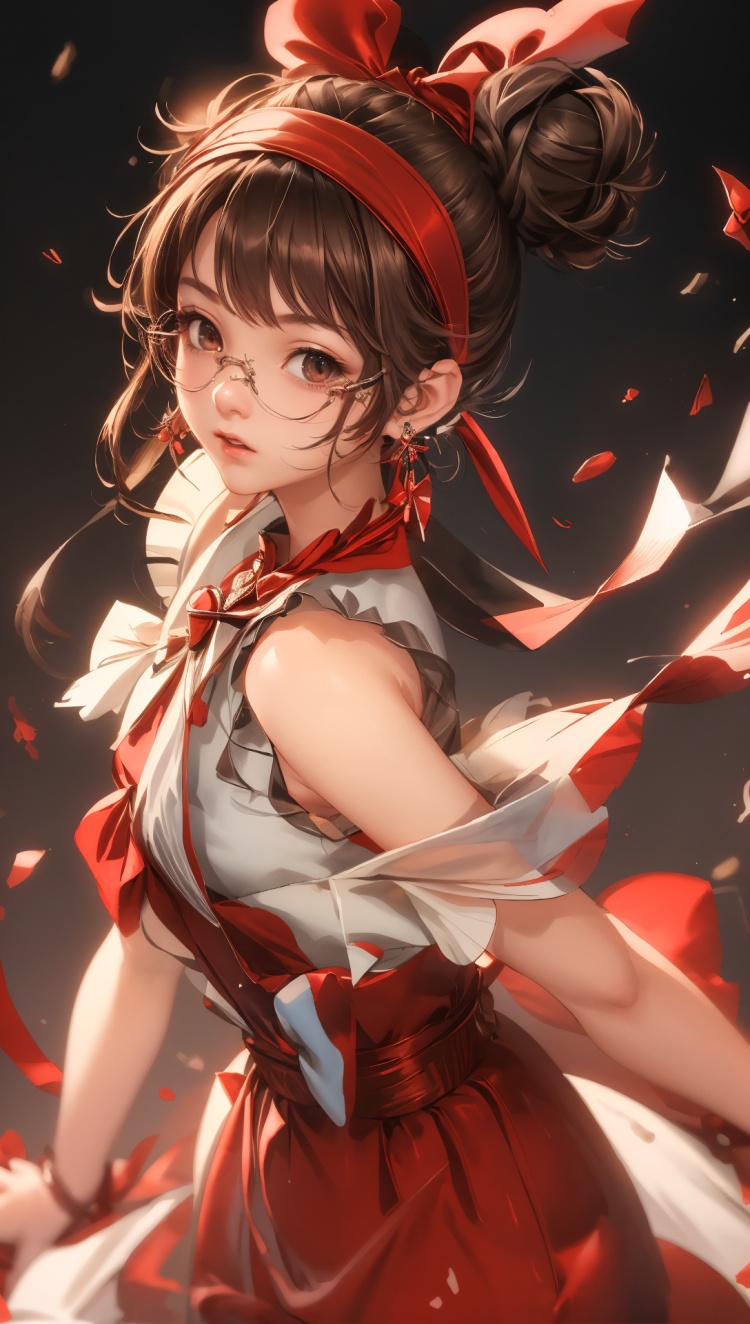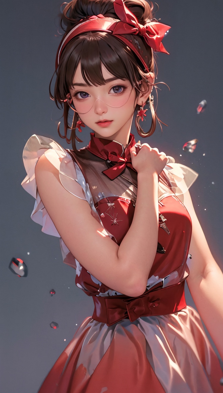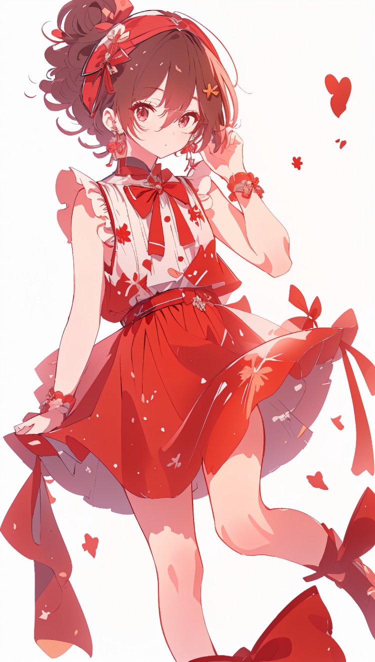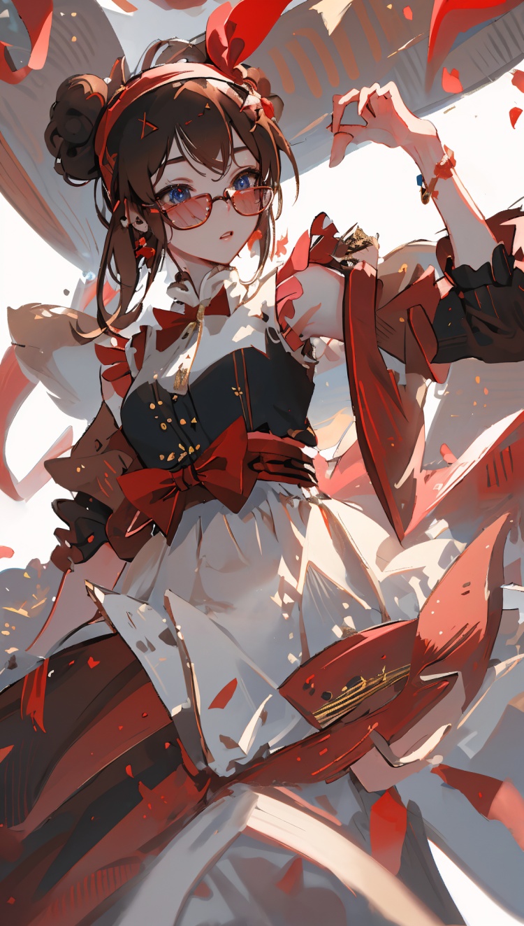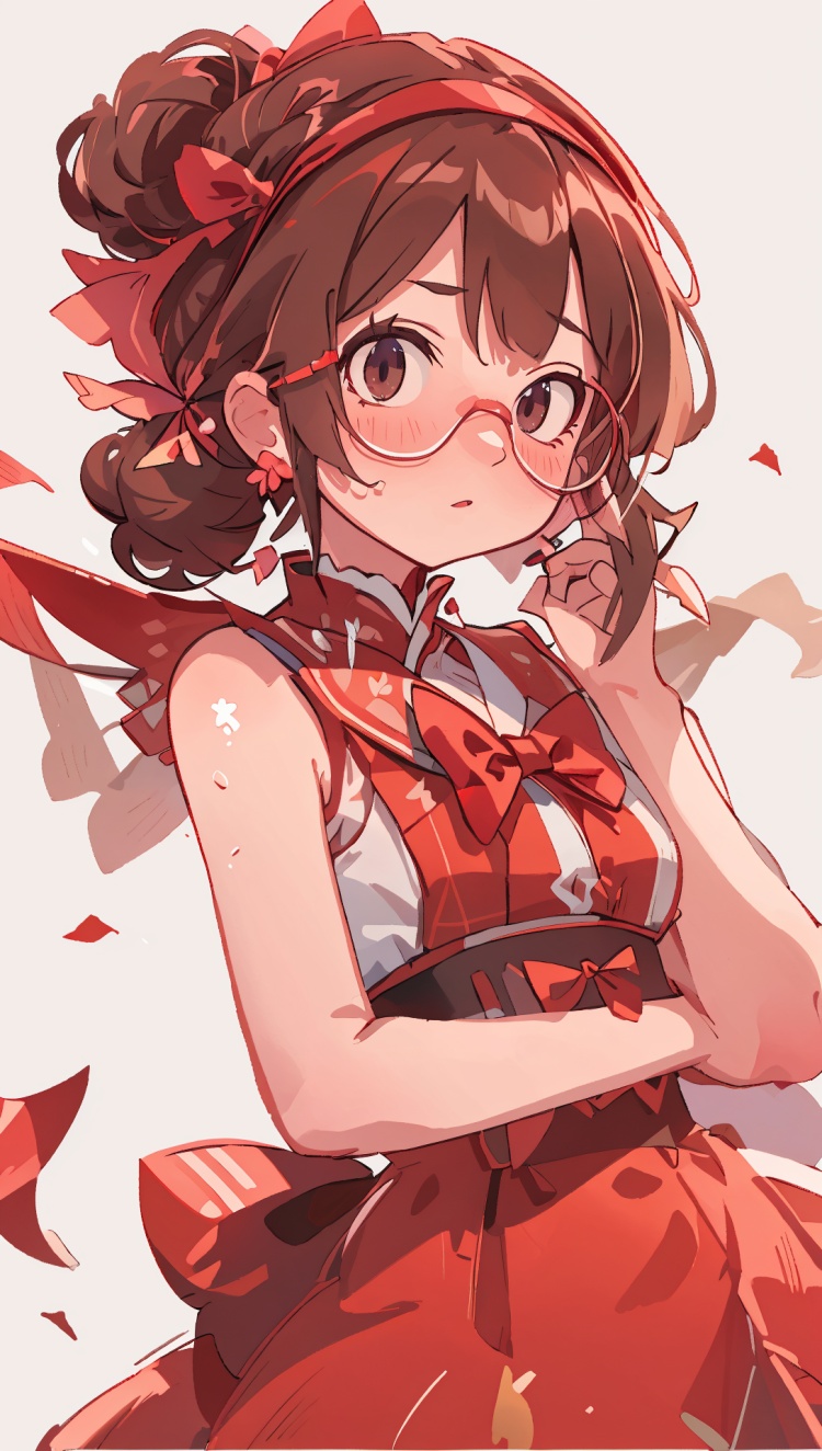 正面提示词:bingzhenkeletaozhuang, 1girl, solo, brown hair, earrings, jewelry, white background, brown eyes, glasses, hair bow, sleeveless, hairband, looking at viewer, hair bun, single hair bun, bangs, red dress, red bow