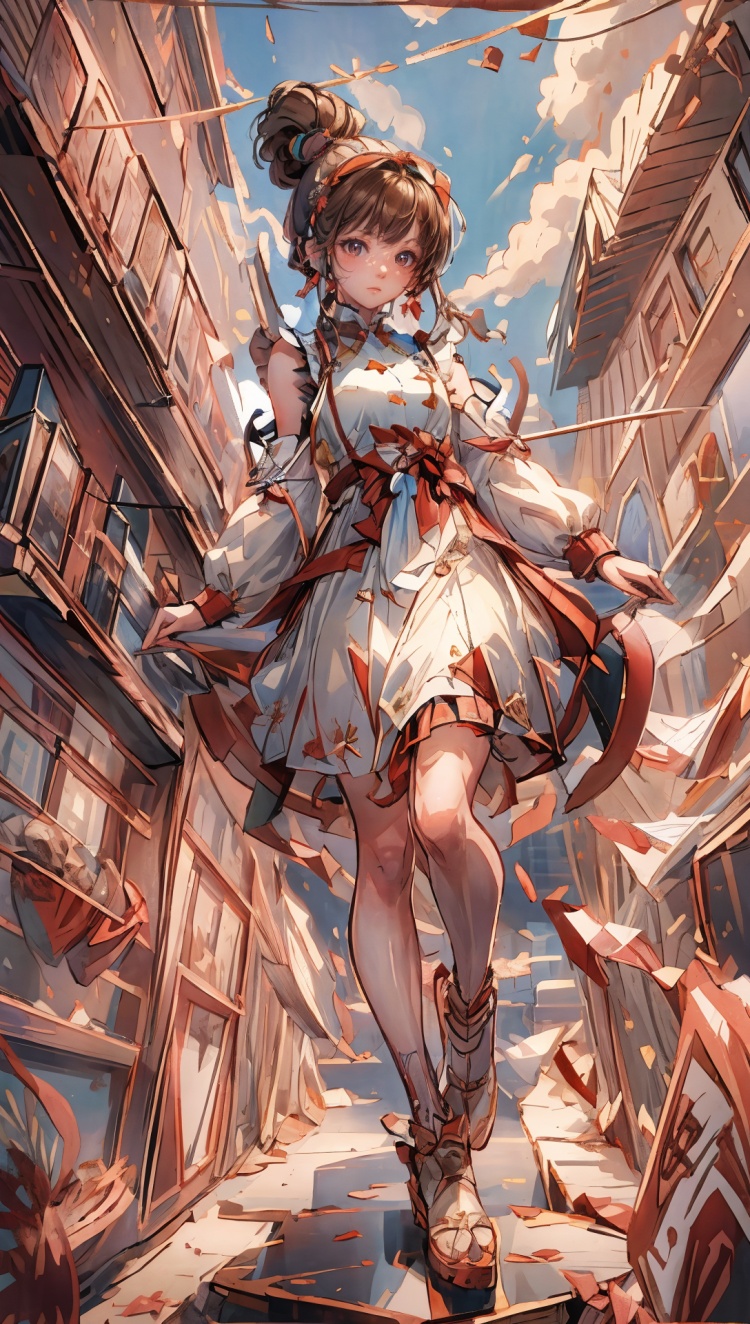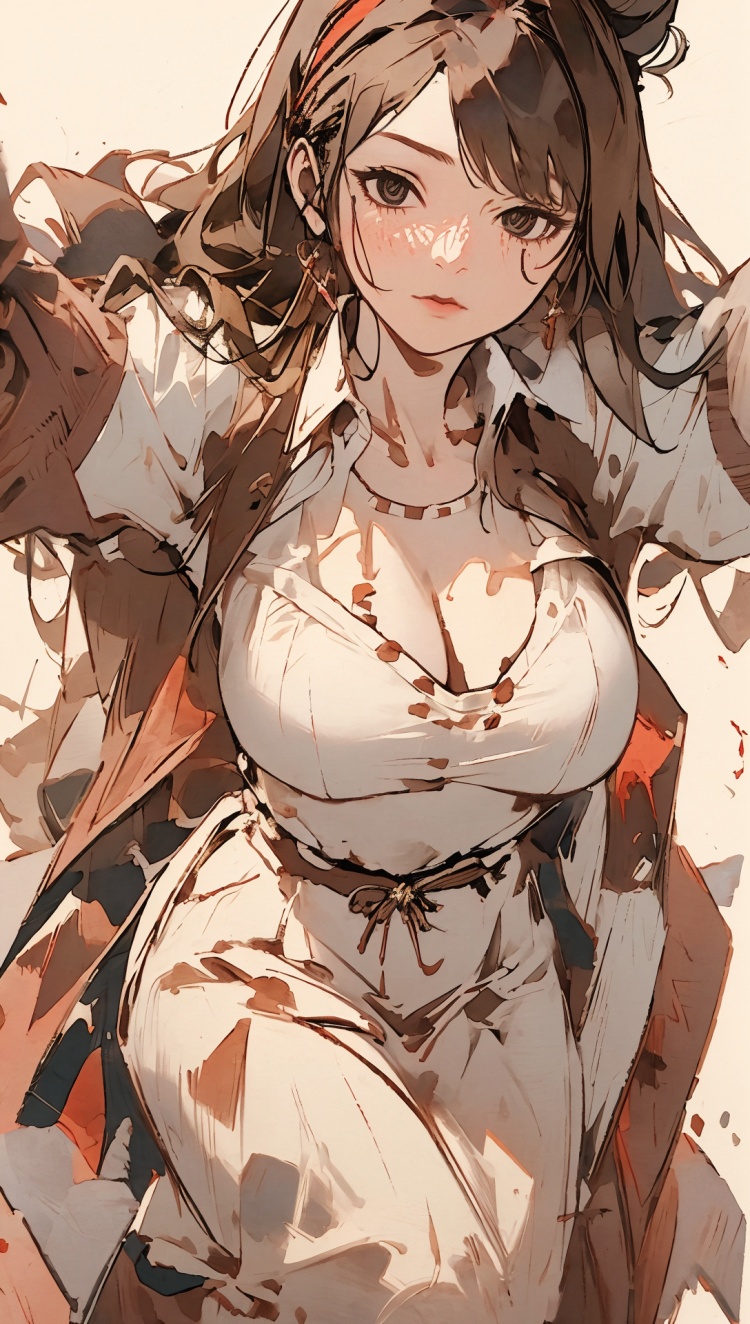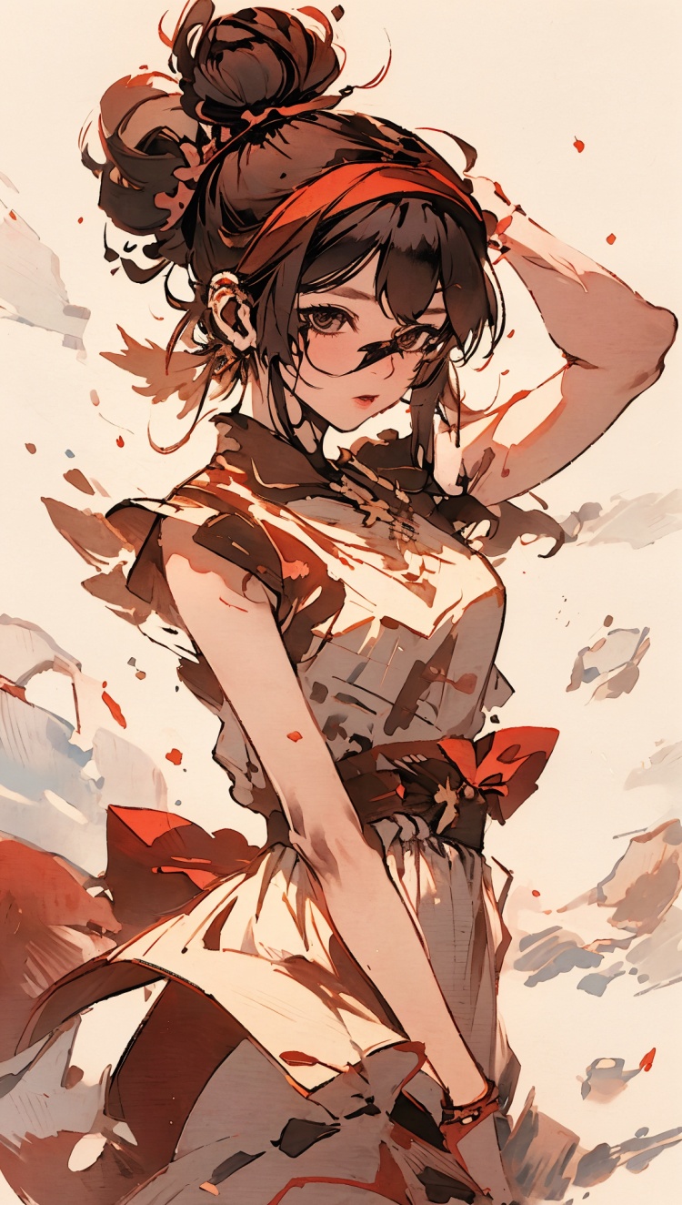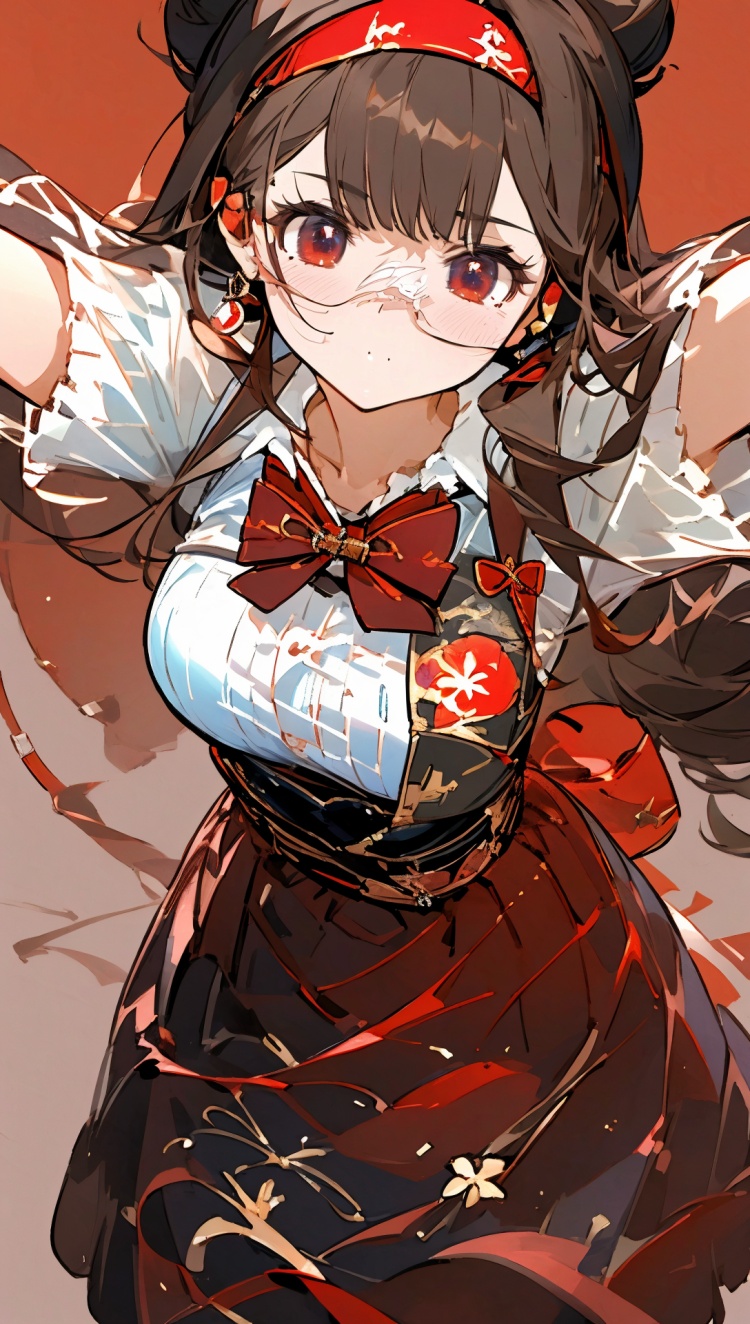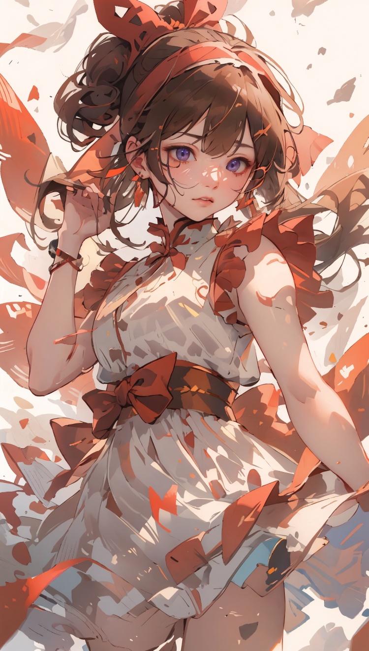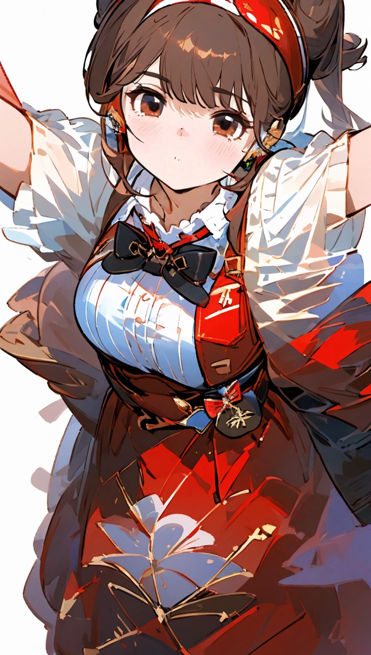 正面提示词:bingzhenkeletaozhuang, 1girl, solo, brown hair, earrings, jewelry, white background, brown eyes, glasses, hair bow, sleeveless, hairband, looking at viewer, hair bun, single hair bun, bangs, red dress, red bow