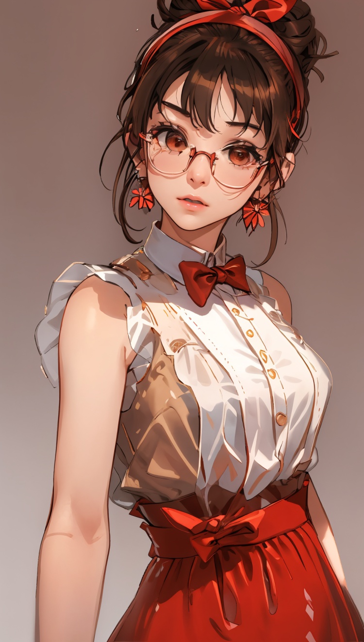 bingzhenkeletaozhuang, 1girl, solo, brown hair, earrings, jewelry, white background, brown eyes, glasses, hair bow, sleeveless, hairband, looking at viewer, hair bun, single hair bun, bangs, red dress, red bow