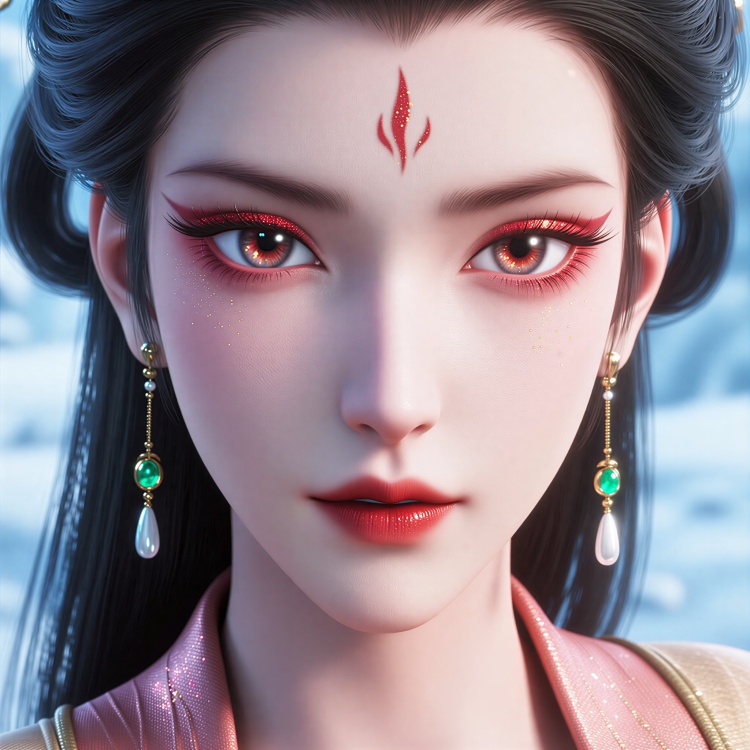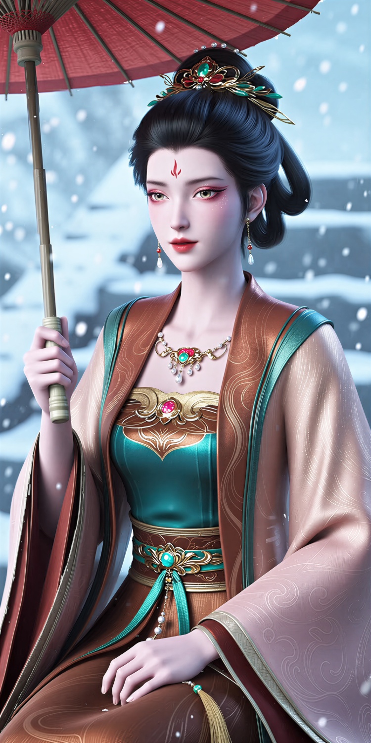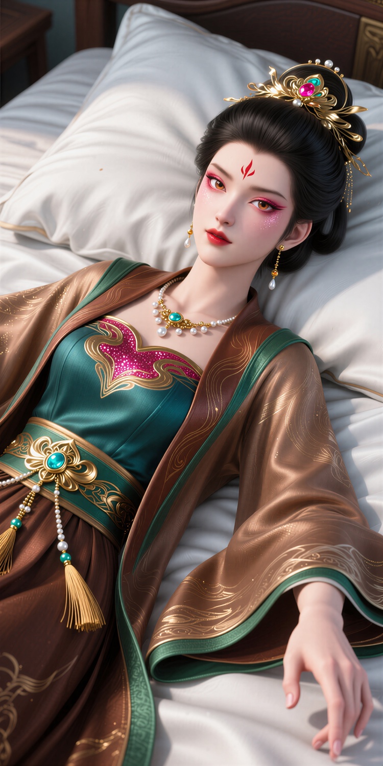 Niangniang, beautifully rendered woman, elaborate outfit, dark hair updo, floral gemstone accessories,Red forehead mark, layered ensemble, deep teal inner, golden embroidery, flowing brown outer robe, wide sleeves, intricate patterns, green borders, detailed belt, golden motifs, tassel ornament, turquoise stone, statement necklace, pearls gems, elegant gold earring, spherical stud, fine chain, teardrop pendant, clear crystal, soft pink eyeshadow, defined eyeliner, subtle makeup, defined eyes, bold lips,Dynamic pose, dynamic angle,