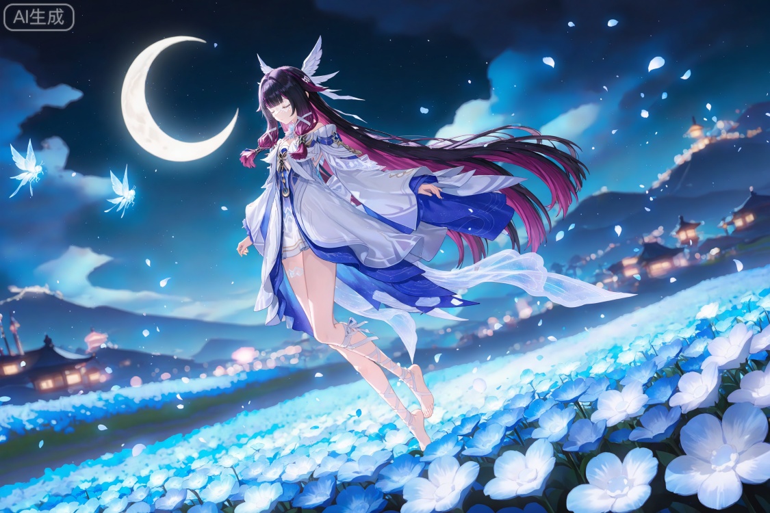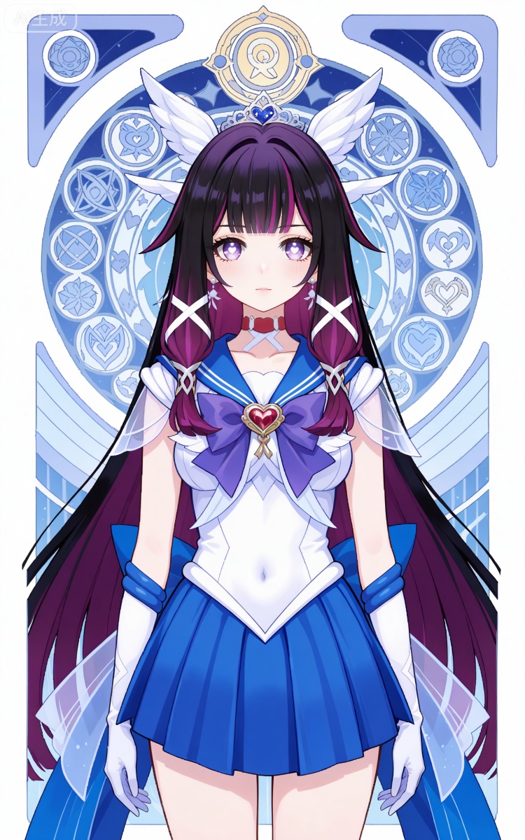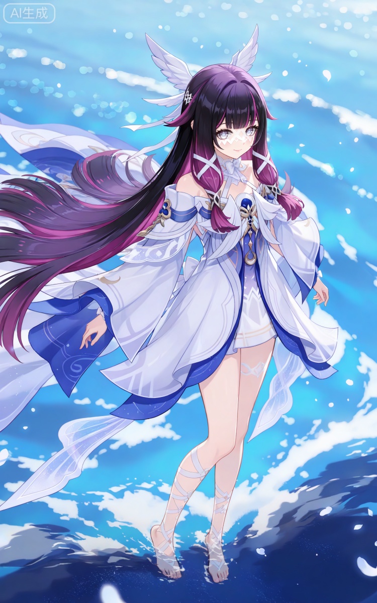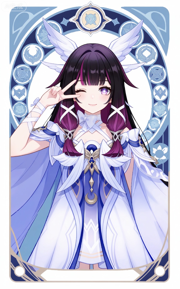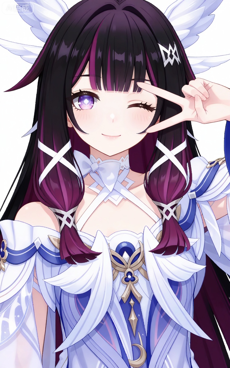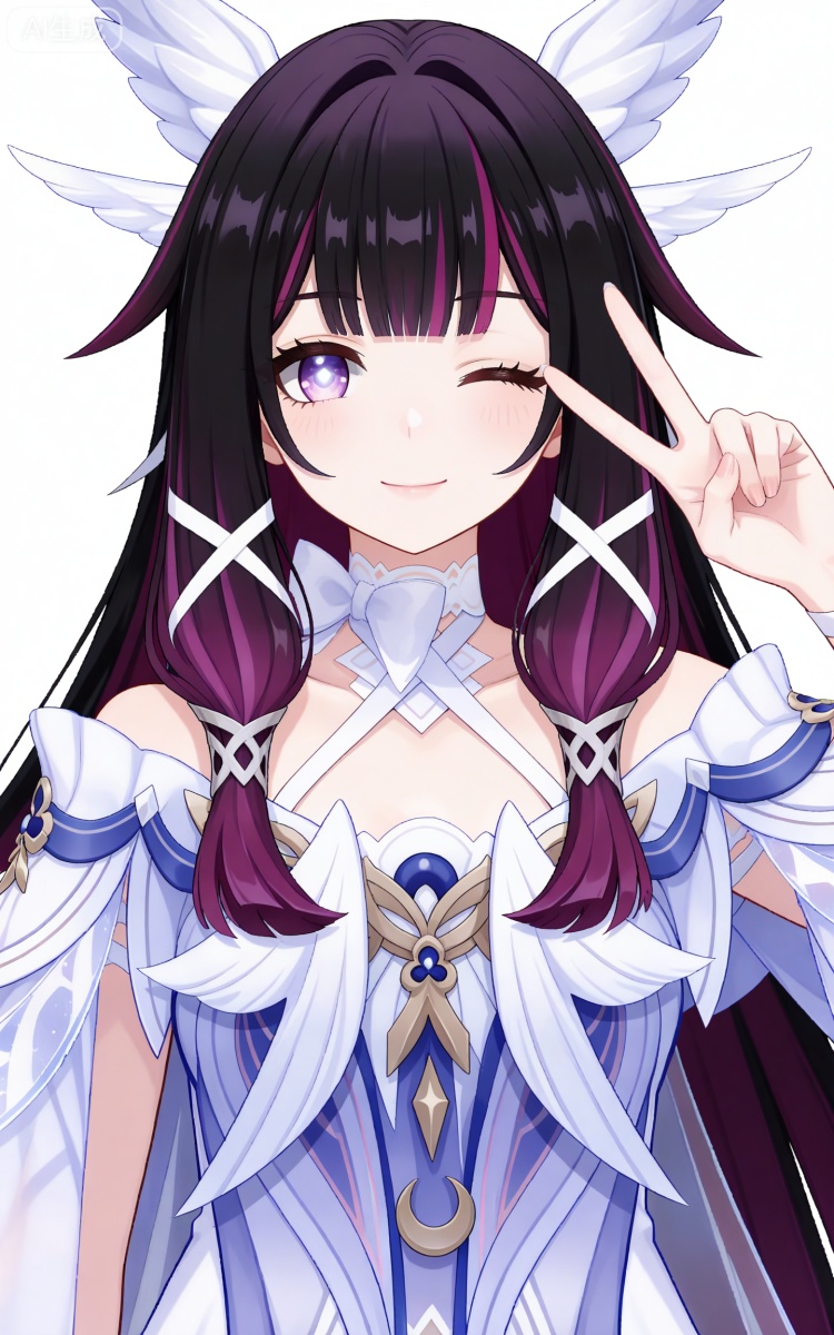 哥伦比娅基础提示词(必填):black hair,long hair,blunt bangs,shaonv white eyes mask,multicolored hair,gradient hair,pink hair,purple hair,streaked hair,two-tone hair,very long hair,wing hair ornament,colored inner hair,clothes:shaonv white short dress,shaonv detached sleeves,shaonv gradient dress,shaonv halter dress,shaonv leg ribbon,shaonv long sleeves,shaonv off-shoulder dress,shaonv wide sleeves,shaonv wrist bow,shaonv wrist ribbon