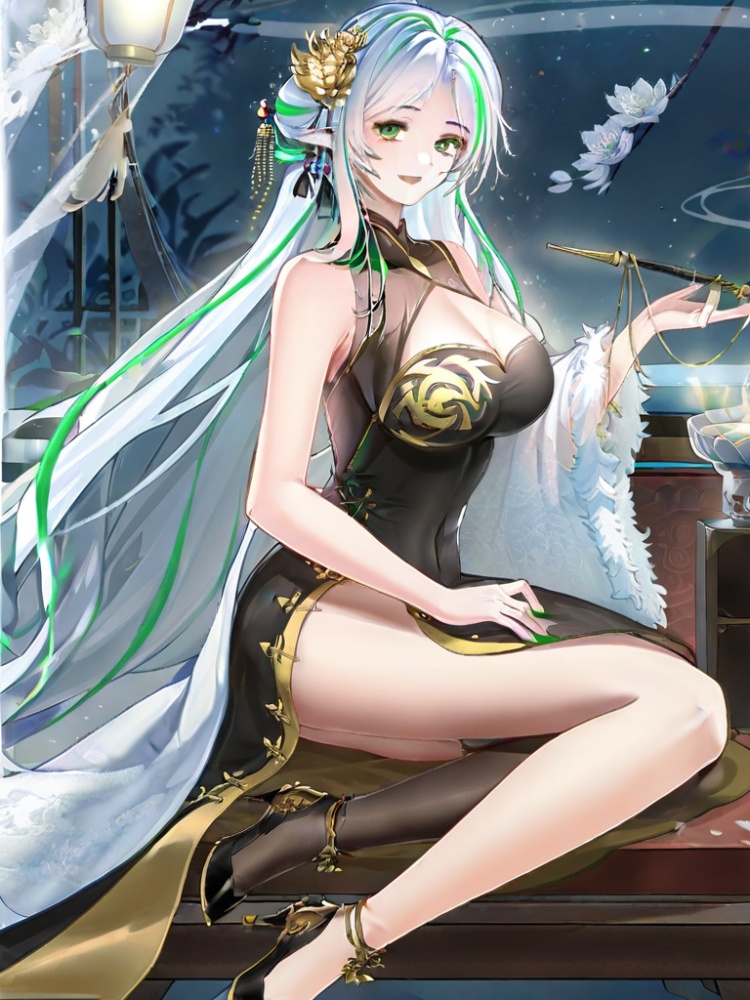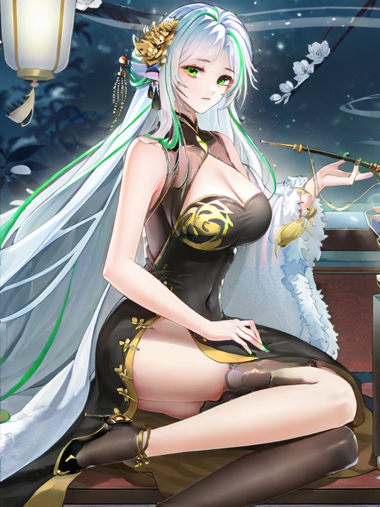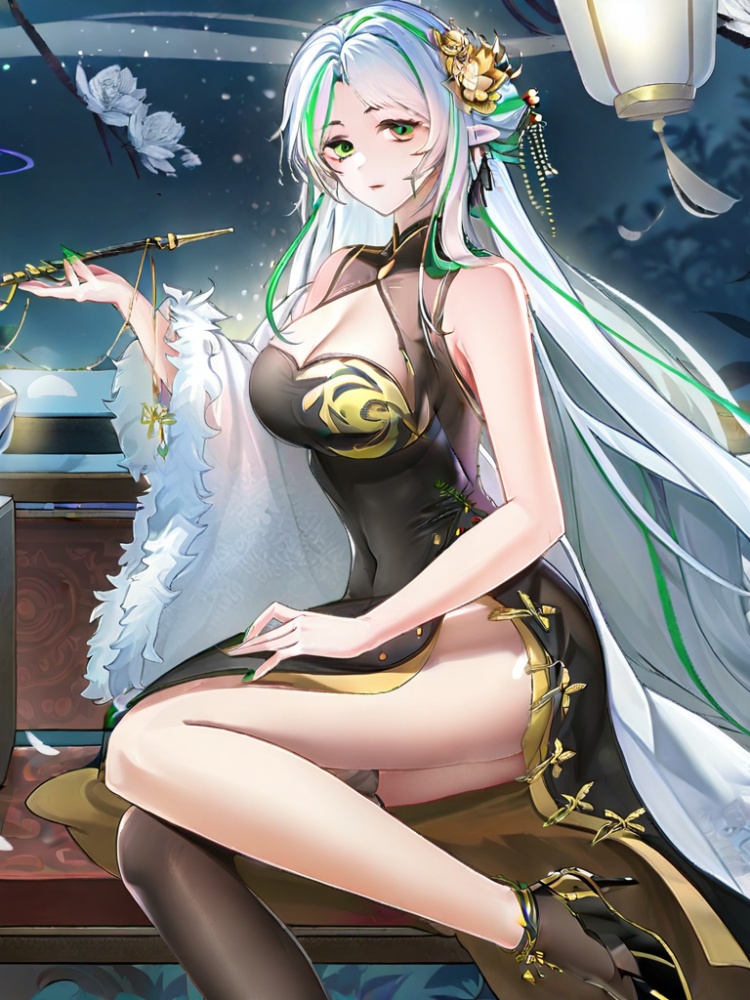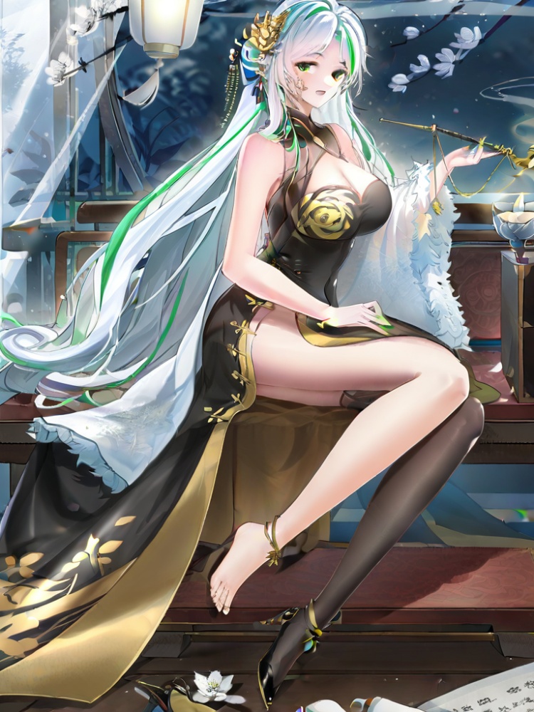 yinhe,solo,long hair,bangs,large breasts,hair ornament,cleavage,bare shoulders,jewelry,very long hair,green eyes,white hair,black thighhighs,indoors,hair flower,black footwear,black dress,high heels,streaked hair,clothing cutout,sleeveless dress,chinese clothes,cleavage cutout,single thighhigh,china dress,gold trim,anklet,floral print,strands of green hair,half worn coat,see-through coat,fur trim coat,hairbun,gold flower,1girl,parted bangs,