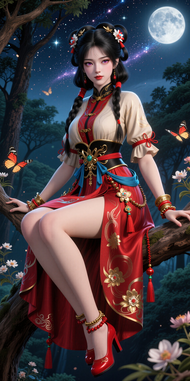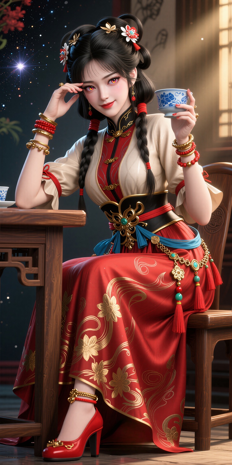 This is Jinyuhuan, This is a digital CGI rendering of an East Asian woman with fair skin and black hair styled in intricate braids and adorned with red and white floral hairpieces. She wears a traditional, ornate dress with a cream-colored top and red, flowing skirt accented with gold floral patterns and a blue ribbon.a black and gold belt with a floral motif. The skirt is decorated with intricate patterns and red tassels. She wears red high-heeled shoes and multiple gold and red bracelets on both wrists.emphasizing her detailed attire.The overall style is highly detailed and realistic, focusing on traditional East Asian fashion elements.