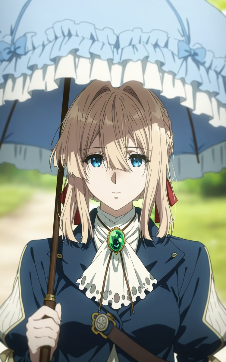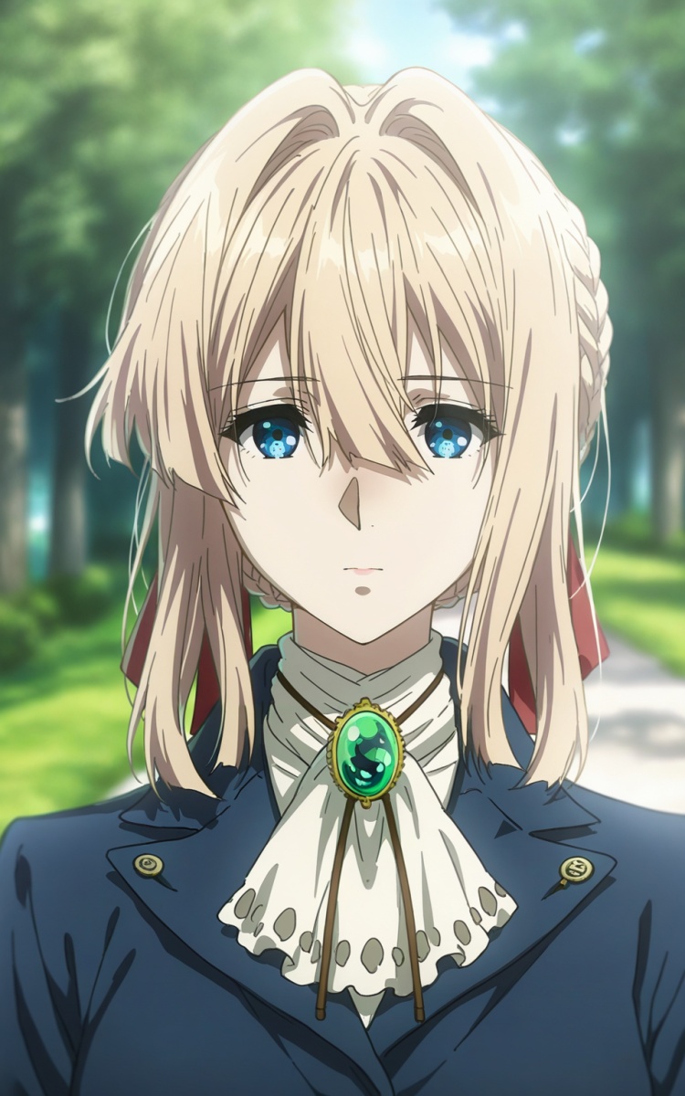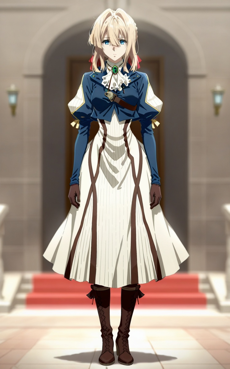 薇尔莉特基础提示词(必填):violet evergarden,blonde hair,blue eyes,short hair,hair ribbon,red ribbon,braid,braided bun,french braid,braided bun,weimei white ascot,weimei green gem brooch,weimei blue and white jacket,weimei juliet sleeves,weimei puffy sleeves,weimei cropped jacket,weimei cross-laced footwear,weimei brown gloves,weimei brown high heel boots,weimei knee boots,weimei high-waist skirt,weimei long skirt,