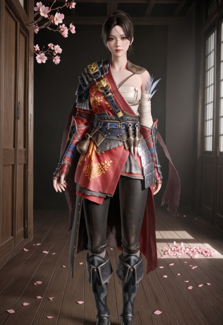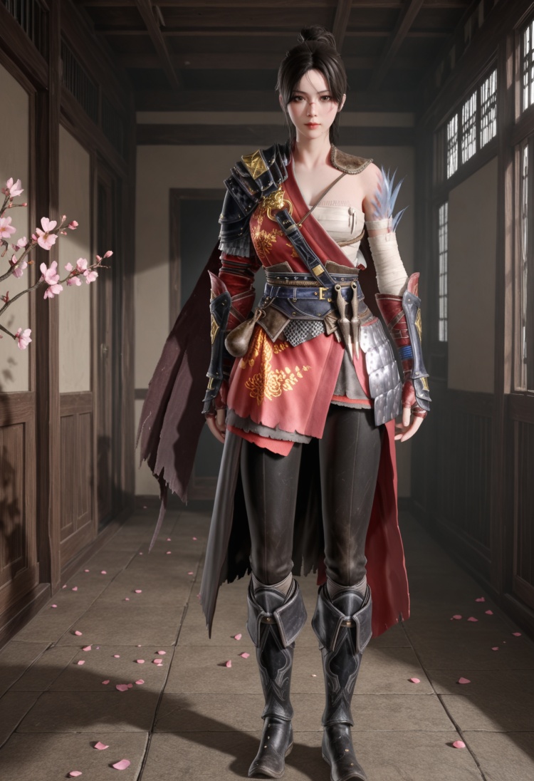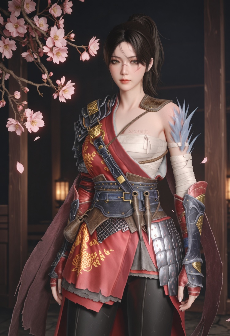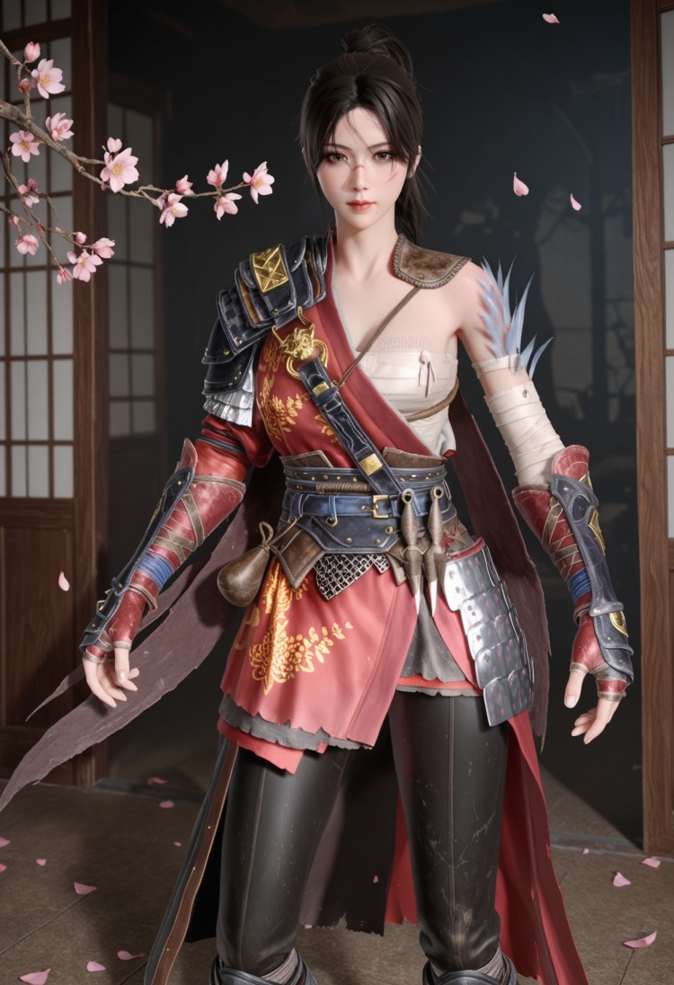 q1528437228,1girl,solo,armor,black hair,ponytail,shoulder armor,brown eyes,sarashi,chinese clothes,brown hair,long hair,gloves,boots,scar,pants,hair bun,fingerless gloves,pauldrons,single hair bun,bandages,scar on face,sheath,cape,belt,short hair,mole under mouth,black pants,sash,single pauldron,gauntlets,knee boots,