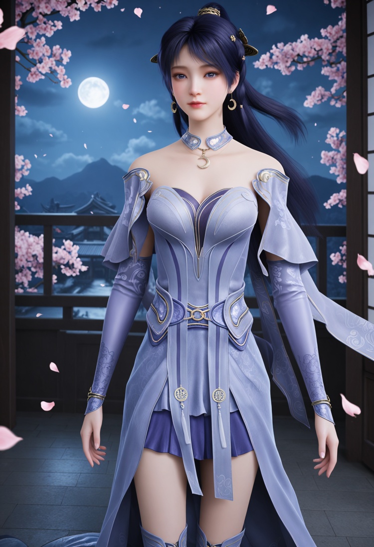 q1528437228,1girl,solo,jewelry,long hair,earrings,hair ornament,dress,crescent,black hair,crescent earrings,purple dress,necklace,blue dress,detached collar,blue hair,blue eyes,purple hair,detached sleeves,choker,ponytail,boots,purple eyes,gloves,long sleeves,skirt,elbow gloves,collar,armor,blue footwear,