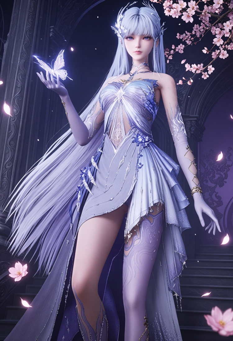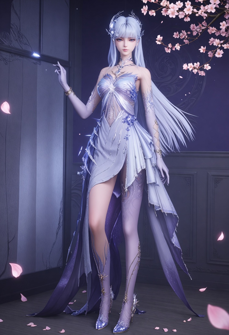 不带翅膀和武器:q1528437228,1girl,solo,dress,long hair,white hair,hair ornament,gloves,high heels,purple eyes,elbow gloves,blue eyes,jewelry,blue dress,blunt bangs,pantyhose,white dress,purple dress,thighhighs,white gloves,purple pantyhose,thighs,earrings,purple footwear,purple gloves,blue hair,purple hair,bracelet,purple thighhighs,strapless dress,