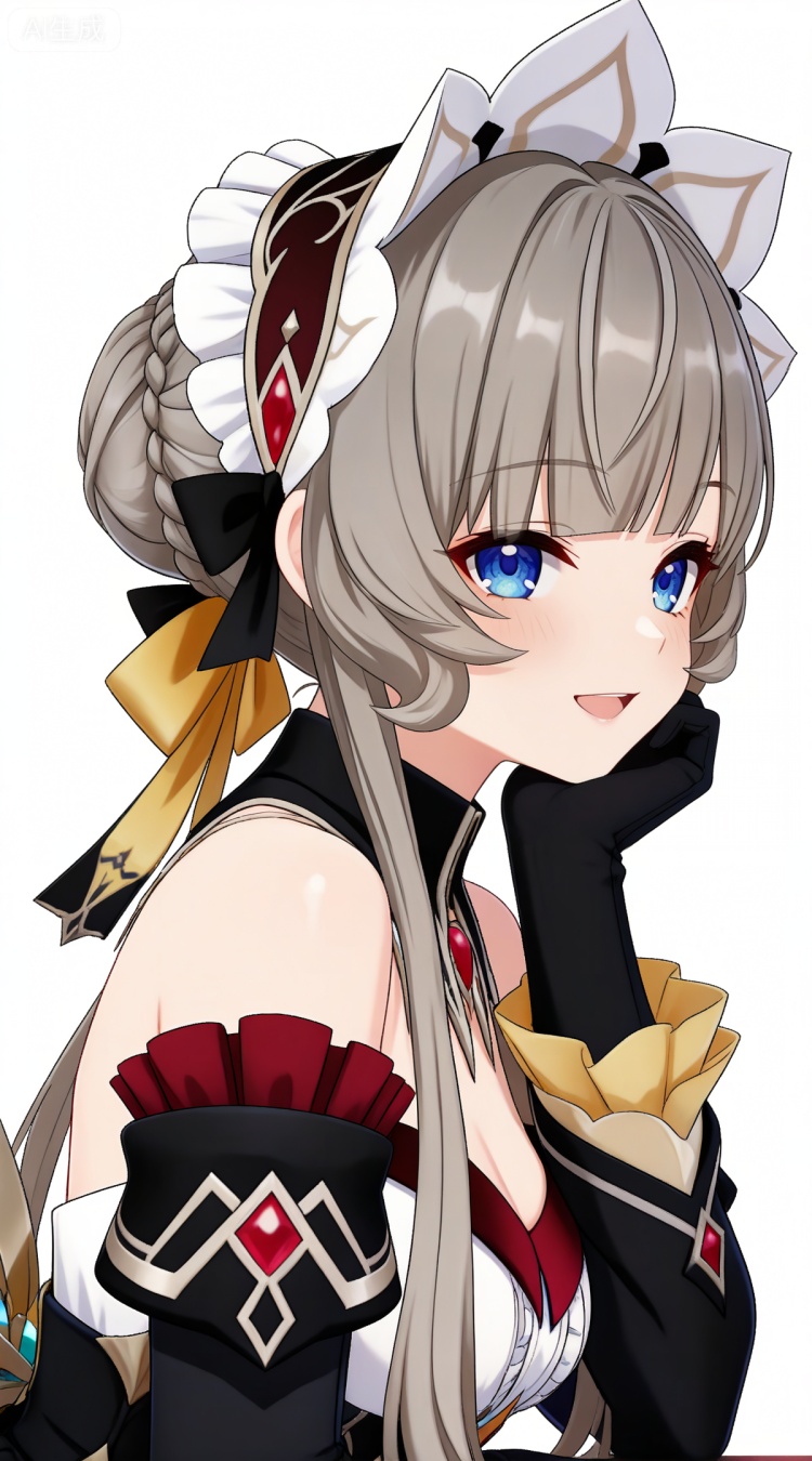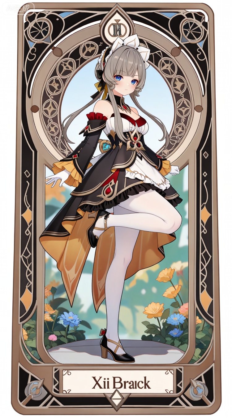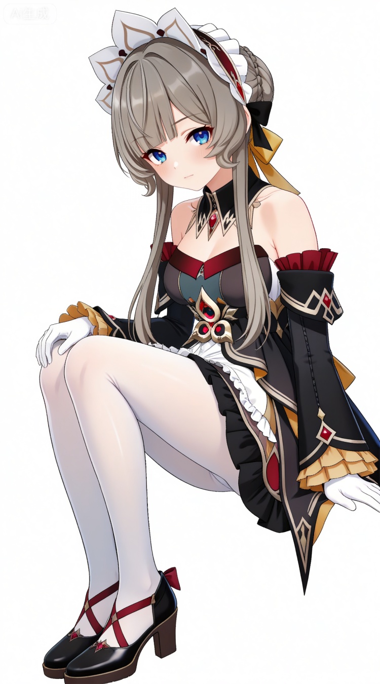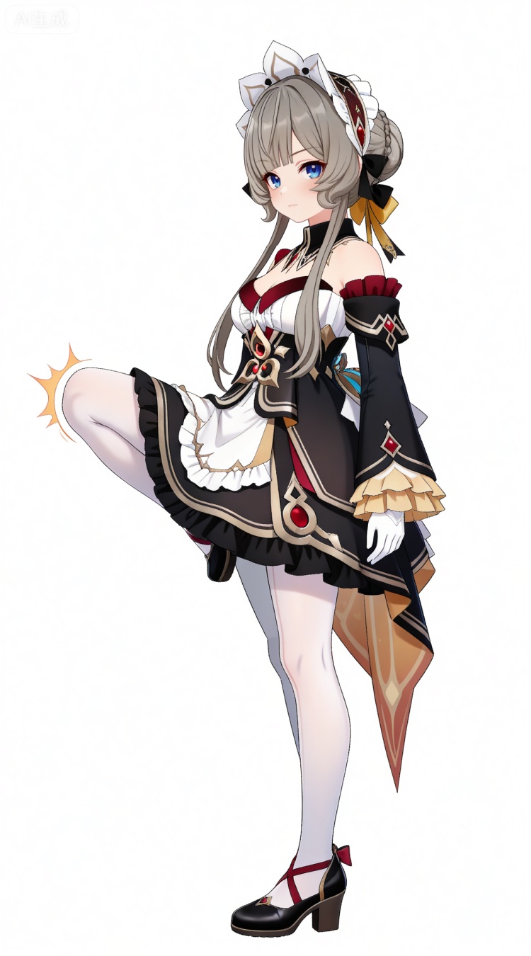 木偶基础提示词(必填):brown hair, grey hair, blue eyes, blunt bangs, braid, braided bun, detached collar, hair bow, headdress, maid headdress, hair bun, french braid, short hair with long locks, muou black and white dress, muou detached sleeves, muou frilled sleeves, muou white pantyhose, muou high heels, muou white gloves,