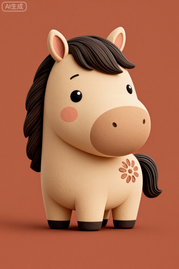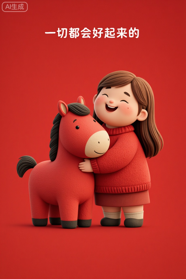 提示词参考:一匹可爱的卡通马,圆脸头顶有黑色短发,身穿带有金色传统花纹的红色针织毛衣和深色灯芯绒裤子,站立在深红色纹理布料背景上。旁边放着一碗金黄色的饺子,右侧悬挂一盏竹编灯笼。顶部中央竖排写着金色汉字“春节”。底部白色文字为“HAPPY NEW YEAR”。风格:童趣、手作玩偶感、布艺质感、柔和灯光、暖色调、中国新年主题、高细节、极简构图。