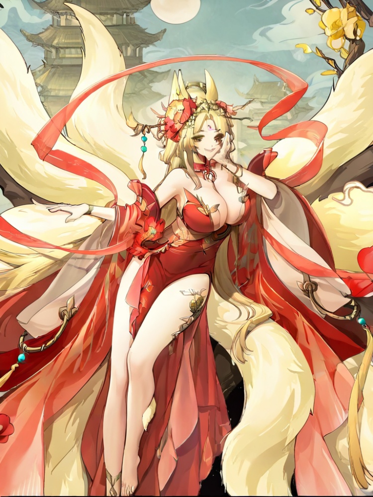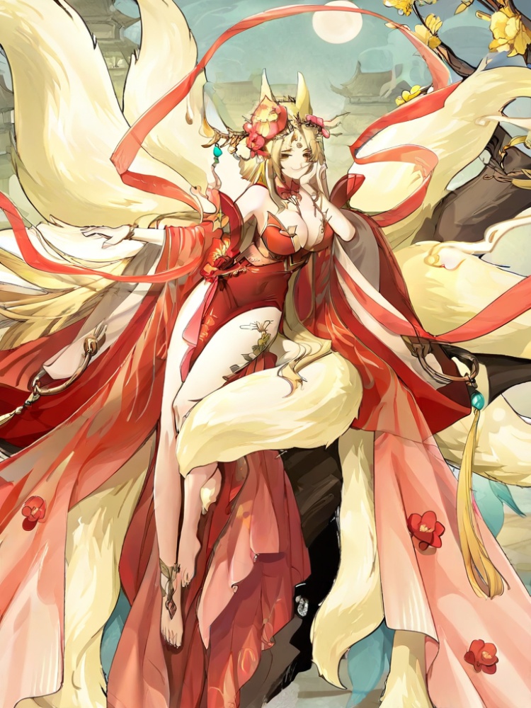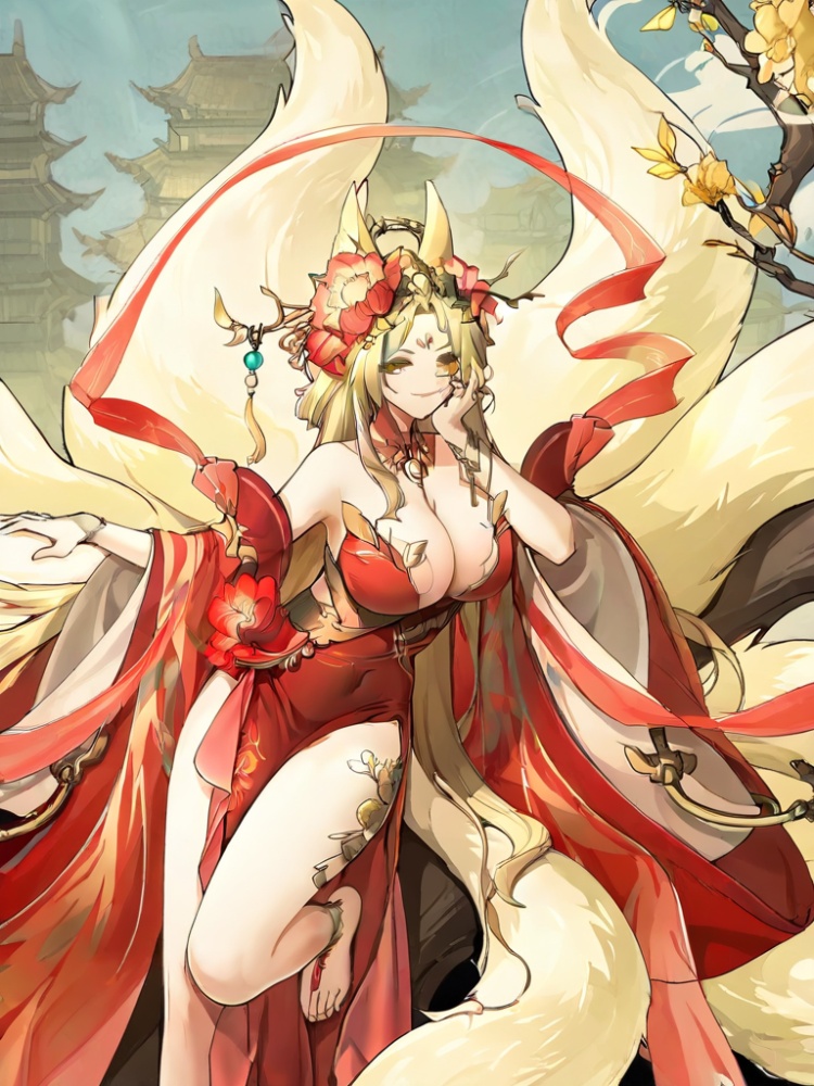 yinhe, solo, long hair, breasts,blonde hair, hair ornament, cleavage, jewelry, bare shoulders, very long hair, yellow eyes, detached sleeves, barefoot, hair flower, wide sleeves, bracelet, parted bangs, clothing cutout, fox ears, fox tail, chinese clothes, red dress, fox girl, multiple tails, pelvic curtain, floating shawl, forehead mark, single anklet, architecture, kitsune, east asian architecture, red peony, single anklet, tiara, thigh mark, gold trim, red shawl, kyuubi, official alternate costume, 1girl, wide sleeves, detached collar, side slit, peony, waist flower, tassel,