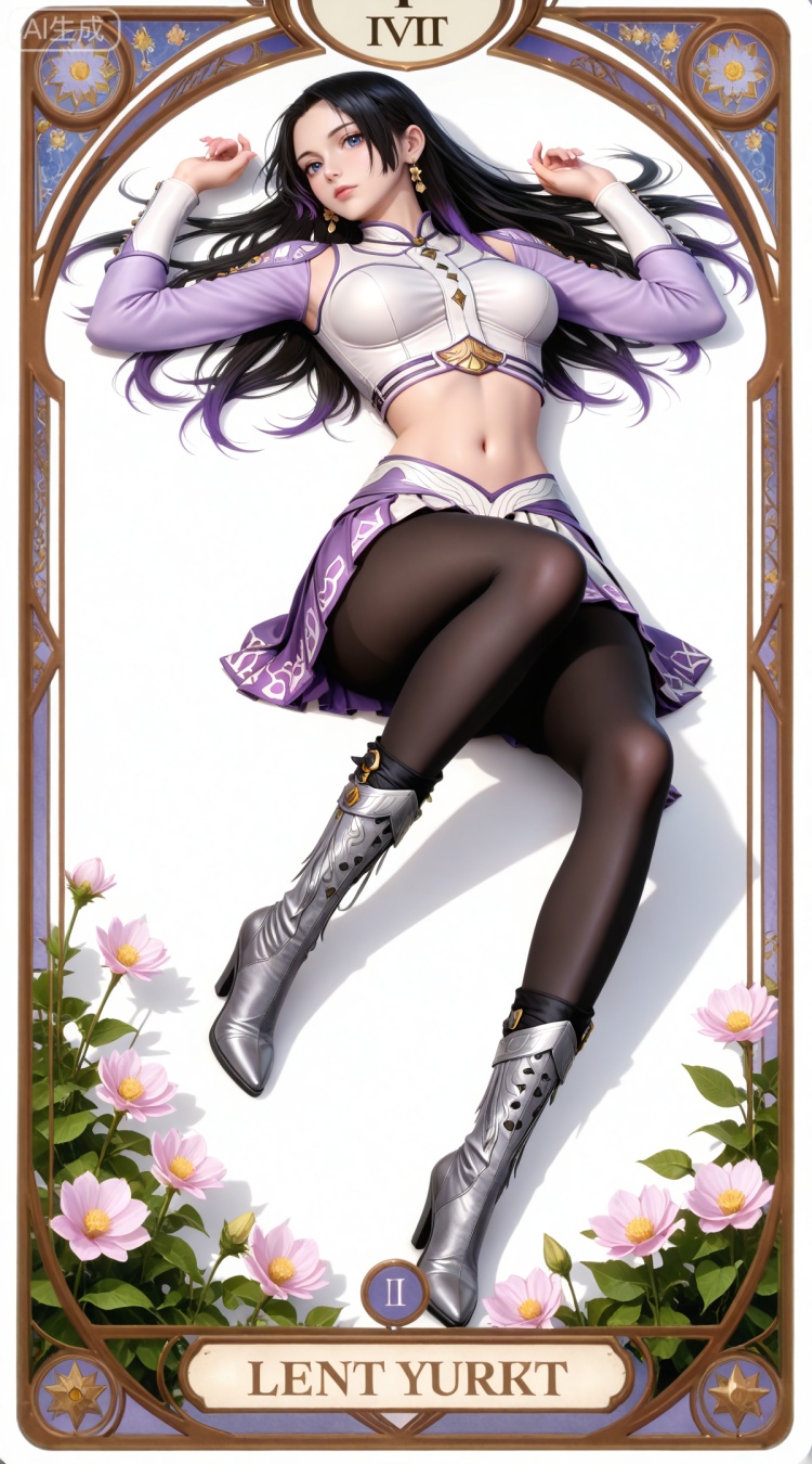 白沉香服装提示词:clothes: baichenxiang white and purple crop top, clothes: baichenxiang purple miniskirt, baichenxiang high heel boots, clothes: baichenxiang pleated skirt,