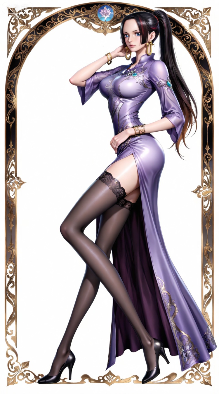 比比东服装提示词:clothes: bibidong purple dress, bibidong black pantyhose, bibidong thighhighs, bibidong high heels,