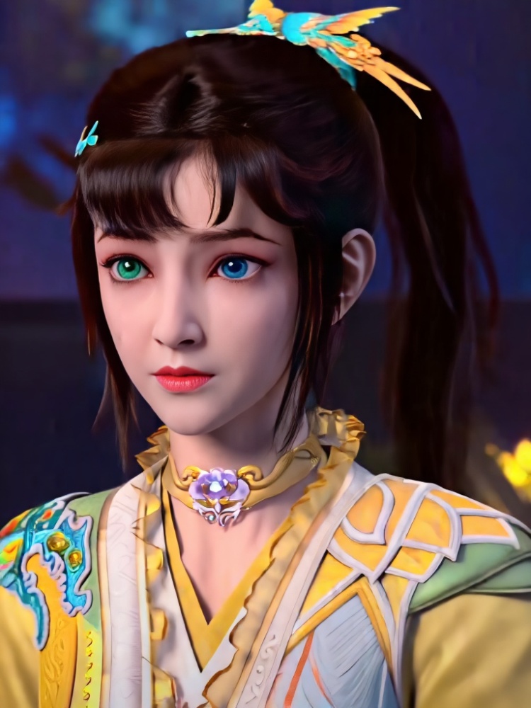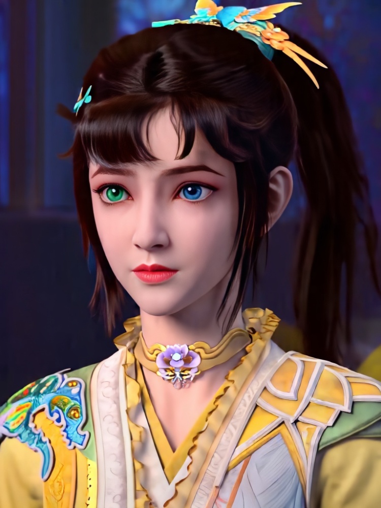 sikongqianluo,3d,一位拥有异色瞳孔的年轻女子她的黑发束成高马尾,装饰着精致的天蓝色蝴蝶结和黄色羽毛发夹。