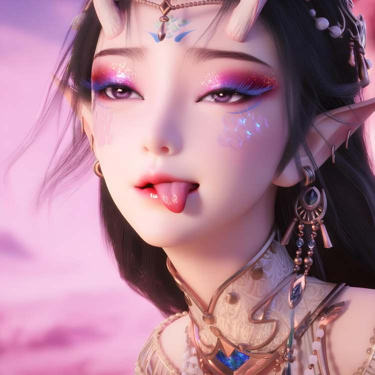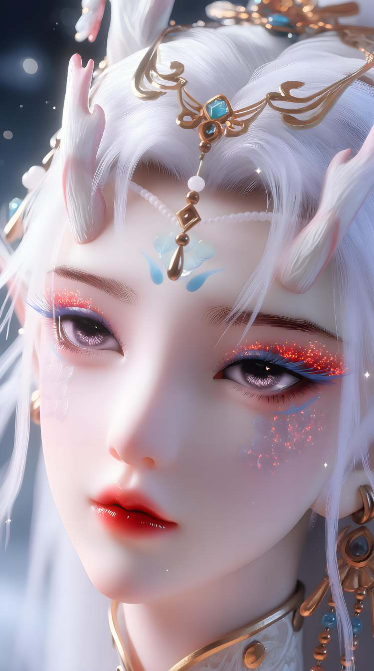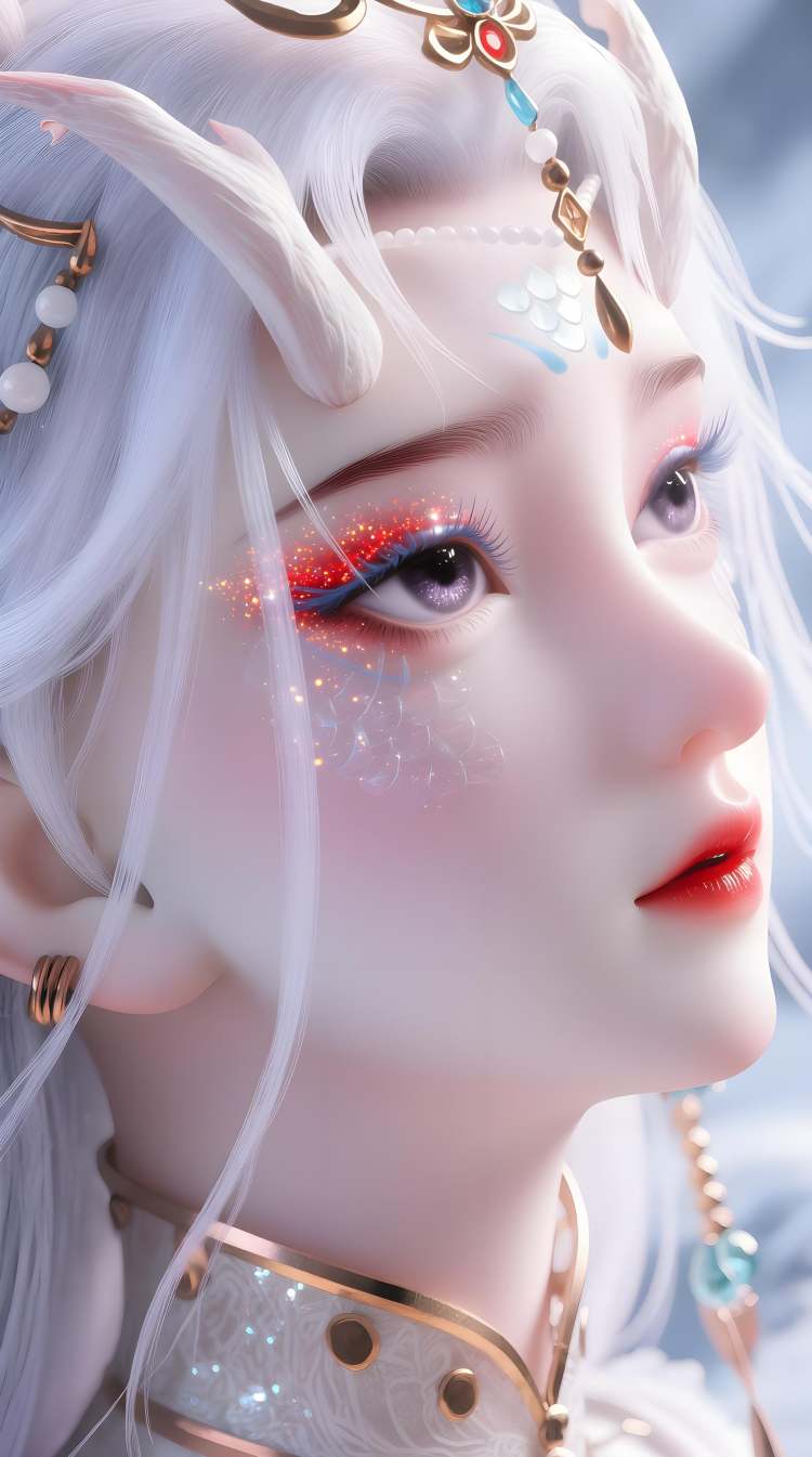 FengNianyun,1girl,long hair,white hair,pointy ears,hair ornament,facial mark,eyelashes,bracelet,horns,white dress,armlet,gem,anklet,1girl, horns, pointy ears, solo, jewelry, long hair, earrings, white hair, makeup, looking at viewer, necklace, gem,armlet,eyeshadow, hair ornament, beads, eyelashes, lips, facial mark,
