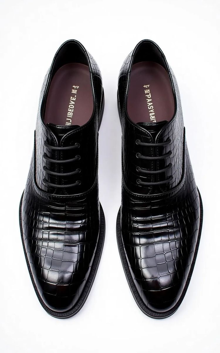 Photograph of a pair of sleek, dark brown leather dress shoes with a glossy finish. The shoes feature a classic brogue design with multiple perforations on the toe caps and a polished, black rubber ****. The laces are also dark brown, matching the shoes. The background is plain white, emphasizing the shoes' elegant and sophisticated style.