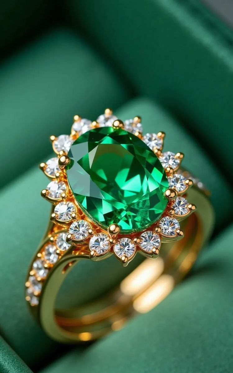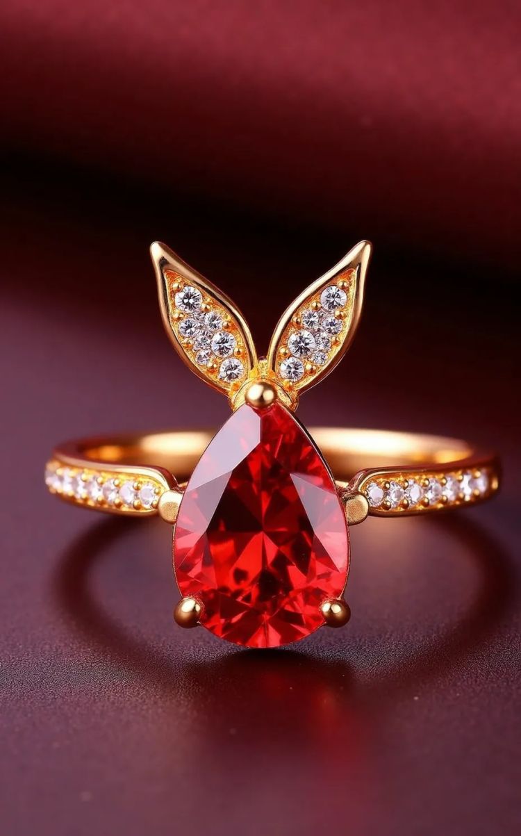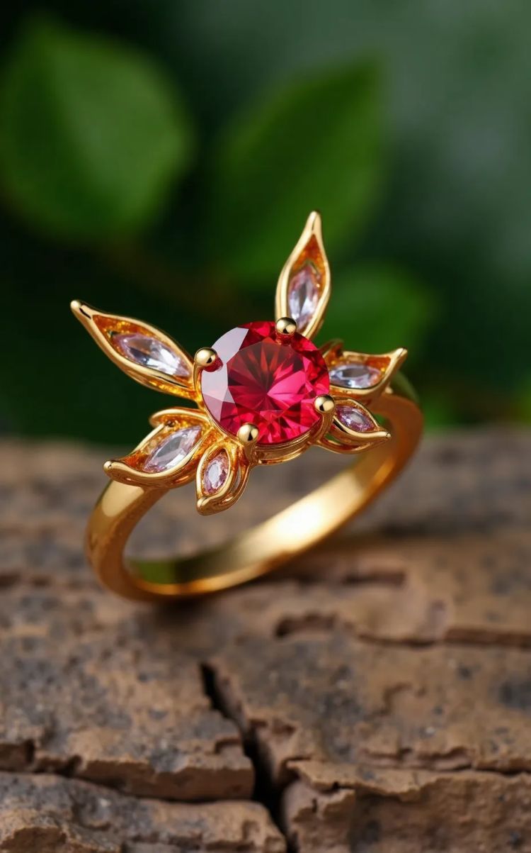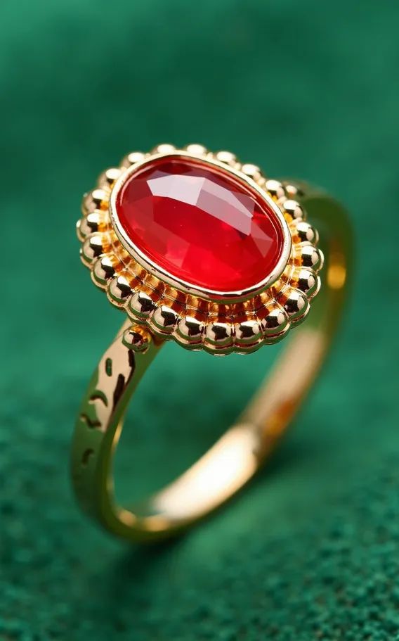 A photo of a gold ring with an oval, vibrant red gem set in a textured beaded border. The ring is located on a textured green fabric background.