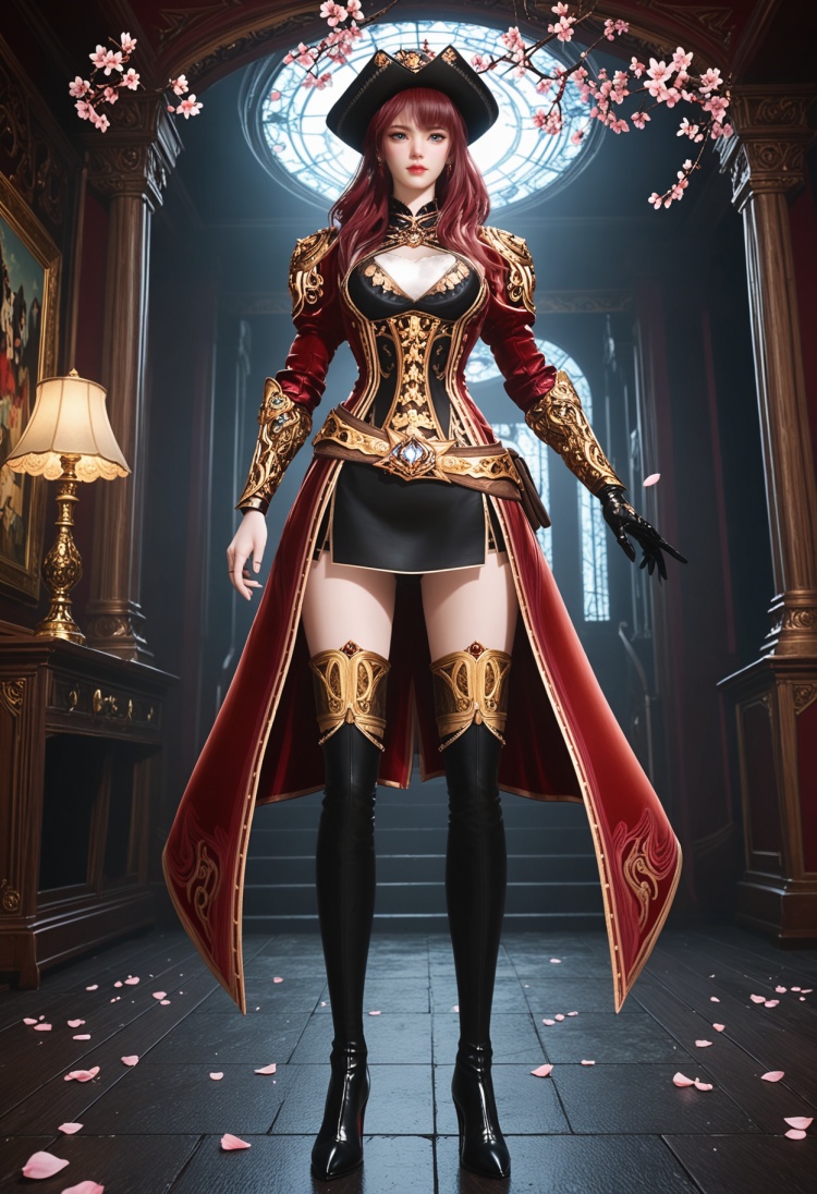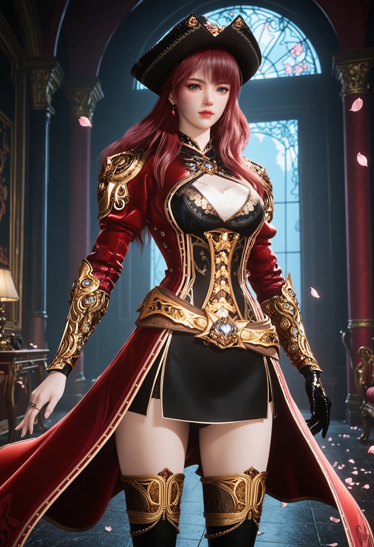 q1528437228,solo,1girl,hat,long hair,red hair,boots,thighhighs,blue eyes,gloves,thigh boots,skirt,armor,pink hair,jewelry,belt,brown hair,pirate hat,earrings,coat,high heels,red coat,black gloves,grey eyes,dress,miniskirt,black eyes,black footwear,high heel boots,black headwear,long sleeves,single glove,