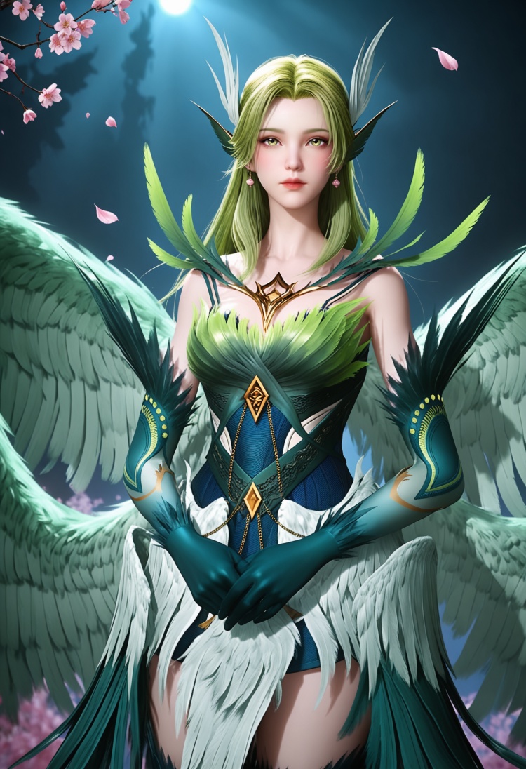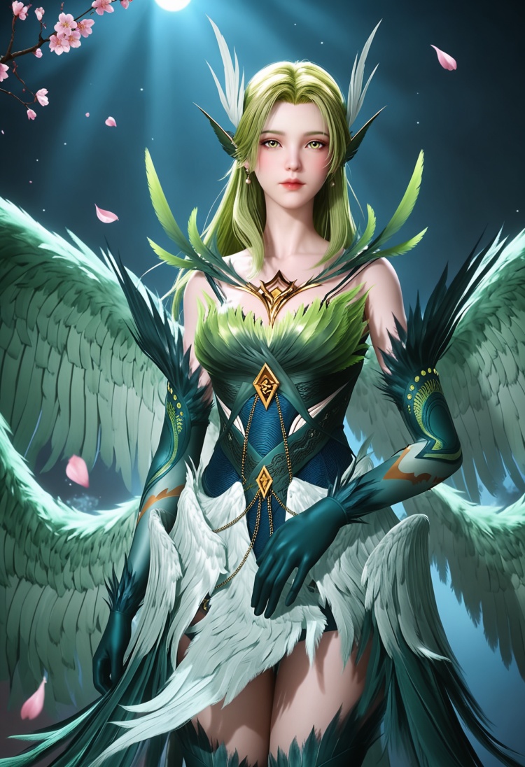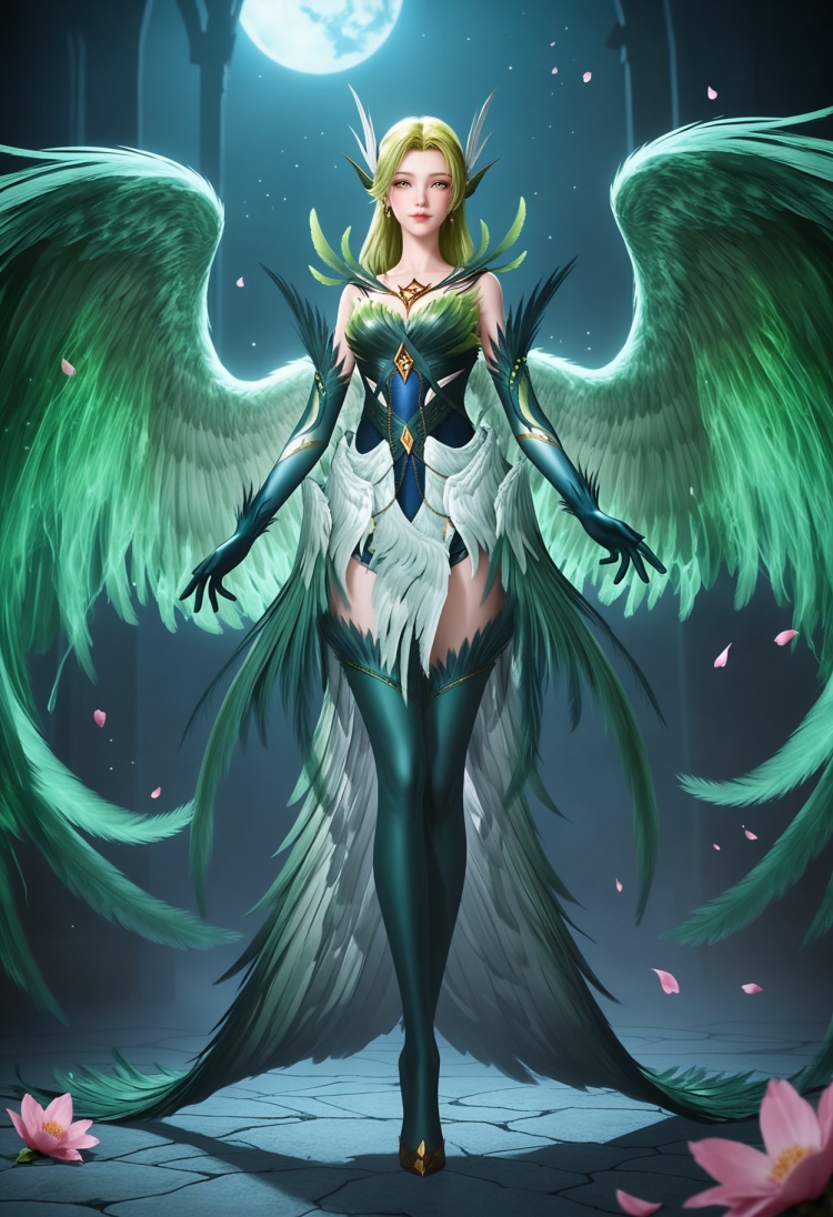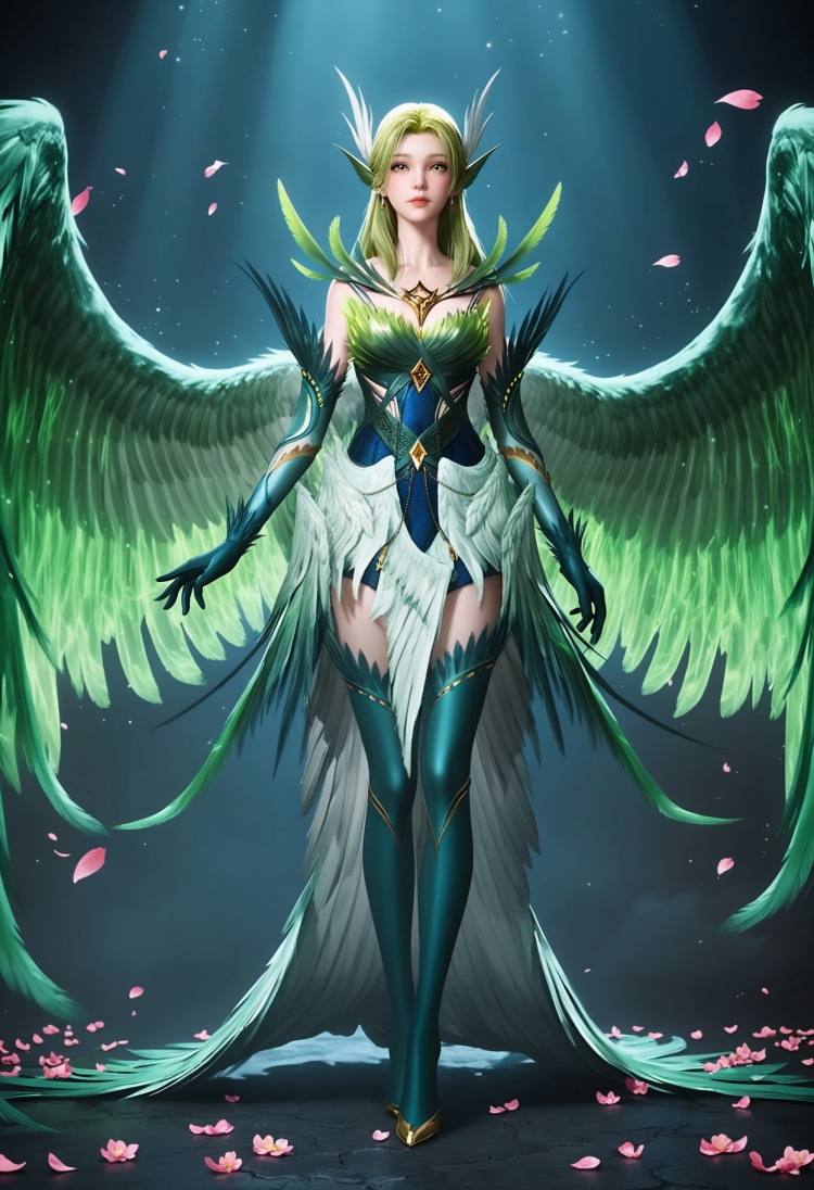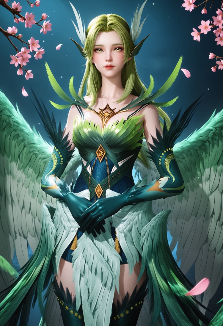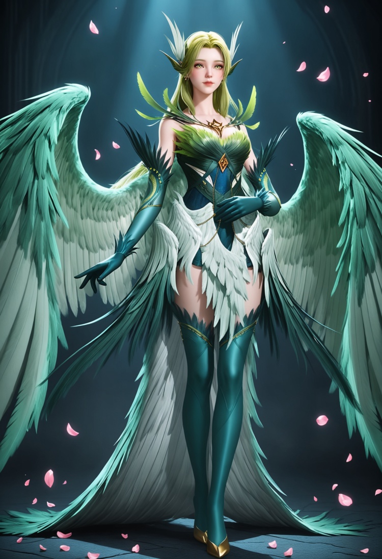 q1528437228,solo,1girl,long hair,green hair,feathers,green eyes,blonde hair,hair ornament,pointy ears,wings,gloves,dress,green wings,elbow gloves,jewelry,feathered wings,green dress,thighhighs,armor,yellow eyes,earrings,green feathers,multiple wings,