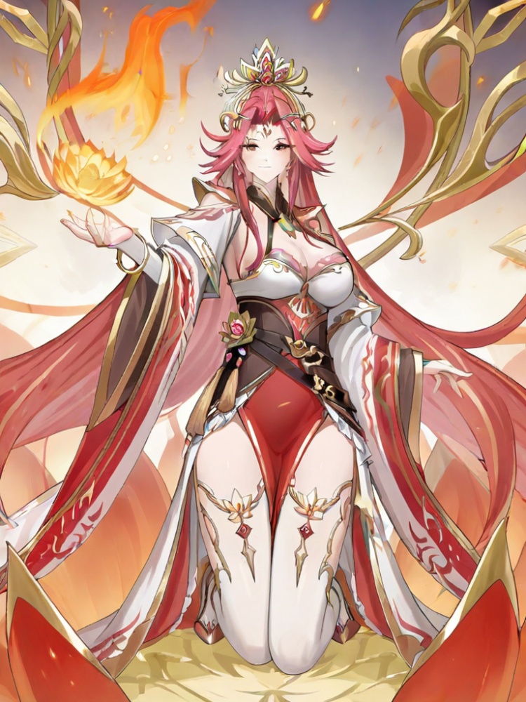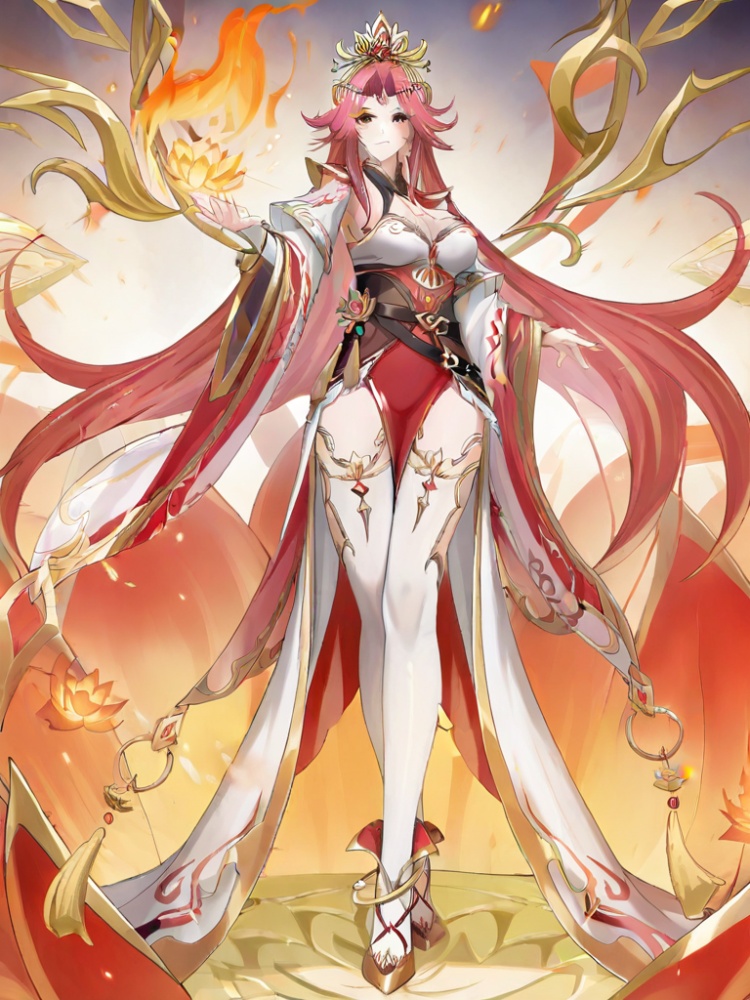 yinhe, 1girl, solo, long hair, breasts, bangs, large breasts, hair ornament, long sleeves, cleavage, jewelry, very long hair, red hair, earrings, wide sleeves, white thighhighs, gold trim, forehead mark, forehead ornament, tiara, belt, pelvic curtain, thighhighs cutout, shoulders cutout, bangs, white bridal gauntlets, gold high heels, bracelet, anklet, two tone dress, pointy ears, hair cover ears