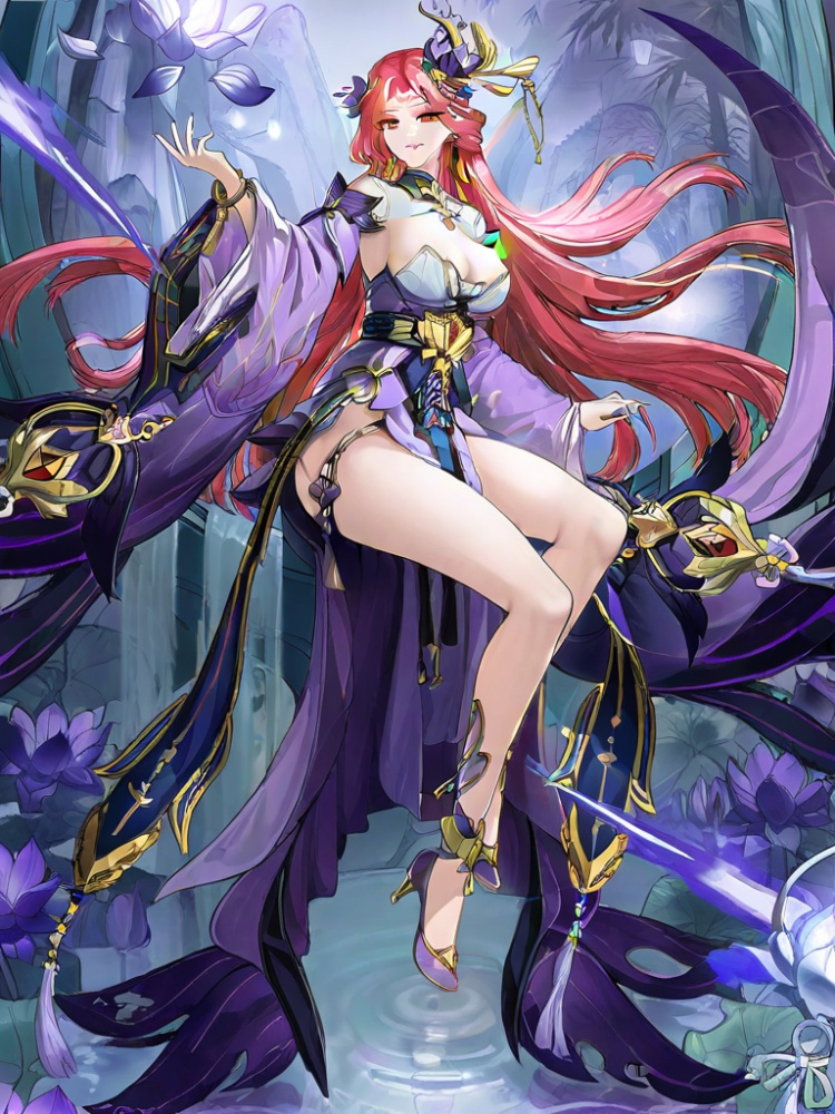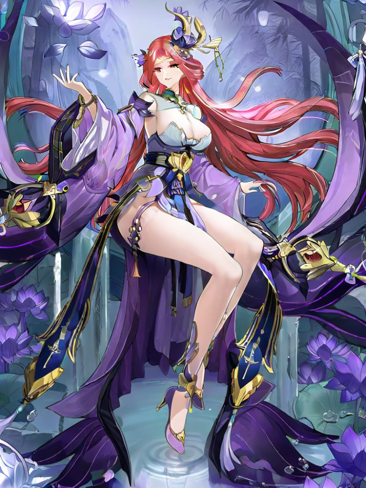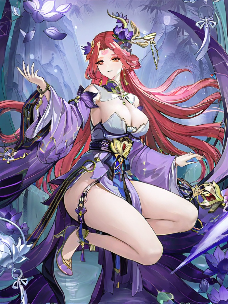 yinhe, 1girl, solo, long hair, hair ornament, cleavage, bare shoulders, jewelry, very long hair, red hair, earrings, detached sleeves, wide sleeves, bare legs, lily pad, lotus, hair rings, detached collar, chinese clothes, belt, side slit, ankle ornament, pelvic curtain, tassel , tassel earrings, hair flower, purple high heels, red eyes, bangs, forehead mark, purple dress,