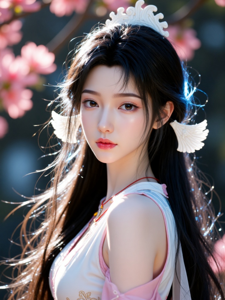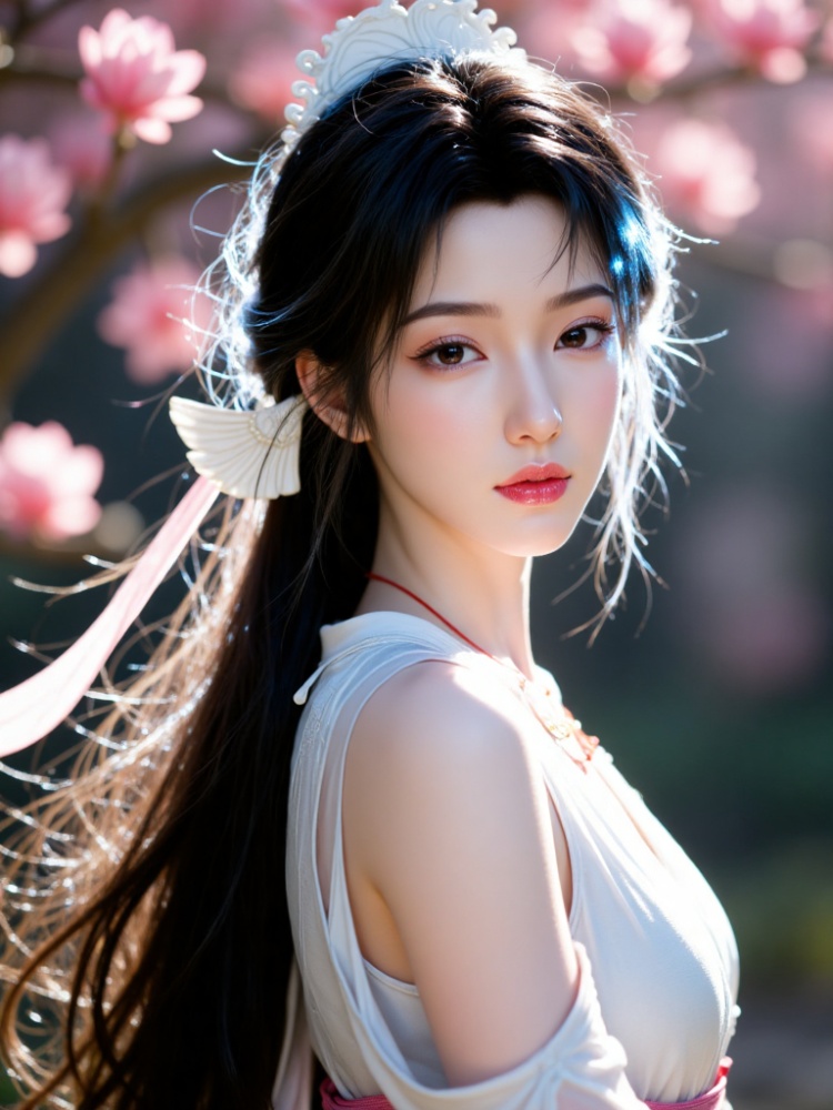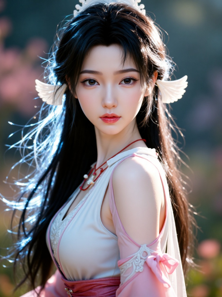 Beauty, skin of a 16-year-old girl, AI-free, highly visually impactful and exquisite wallpaper style, skin as white and delicate as porcelain, no signs of AI synthesis, huge breasts with clear contours, professional smile that is gentle and seductive, charming eyes looking directly at the camera, perfect figure (slender limbs + Tight waistline), the background is lush cochineal flowers, a pink ribbon of a girl in ancient costume fluttering in the wind, her long hair ribbon fluttering in the wind, comfortable and leisurely, bright spring, sense of story, layering, artistic conception, film photography, lens language, light color, the character is a beautiful girl with a handsome face, and the woman's skin is smooth and translucent. She has long black hair, and has a coquettish and shy temperament. Light and shadow highlight the subject, the background is beautiful, beauties in ancient costumes, national beauty, full-body close-ups, cool tones, high appearance, sense of sight, emotional atmosphere, sense of perspective, film grain texture, rich layers, freehand brushwork, hazy aesthetics, light aesthetics, lomo effect, high-end sense, masterpiece, white, clean, smooth, moist, delicate and clear skin. Extreme ultra-clear, illustration, thick paint, gentle temperament, OC rendering, ultra-high-definition picture quality, rich details, strong sense of refinement, extreme ultra-clear, extreme details, sense of atmosphere, narrow and long eyes with upward tail, clean and smooth picture style, showing an extremely clear smooth mirror texture style. 32K pixel compression processing allows all details to be clearly displayed.
