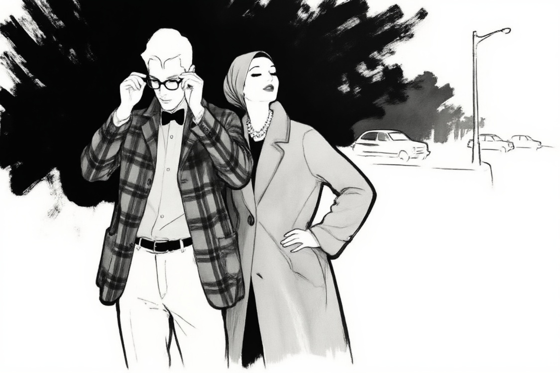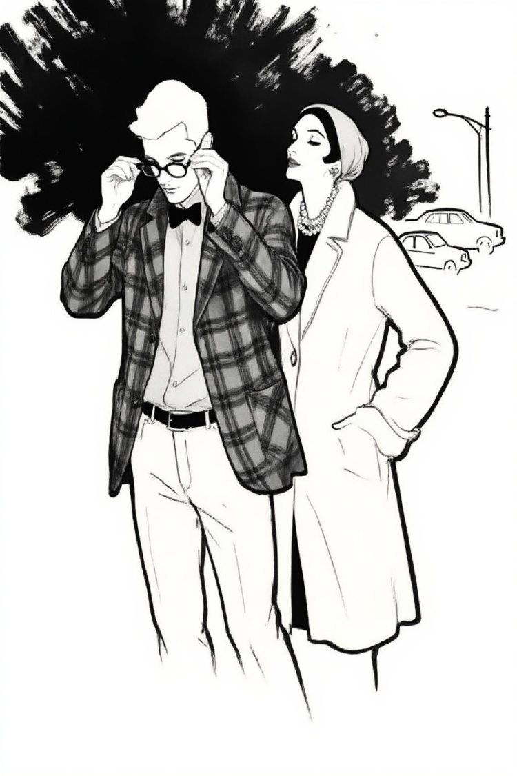 Prompts:renegruau9z fashion illustration. High-angle view of a woman is depicted in a full-body illustration, leaning forward, looking upward and to her right. She wears a dark, long-sleeved top with a deep V-neck and a cinched waist, detailed with a draped sash. Her lower body features tight pants or leggings with a dark argyle diamond pattern, over which a flowing, sheer skirt, also with a diamond pattern, cascades dramatically to her right. She has short, dark hair and wears pearl necklaces and earrings, along with a small cap or fascinator on her head. A white ruffled cuff peeks from her right sleeve. The figure is set against a plain, light background.