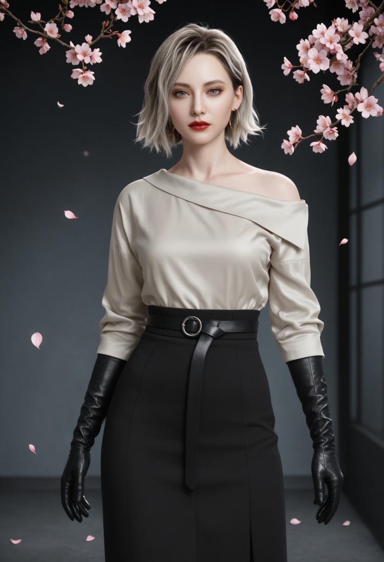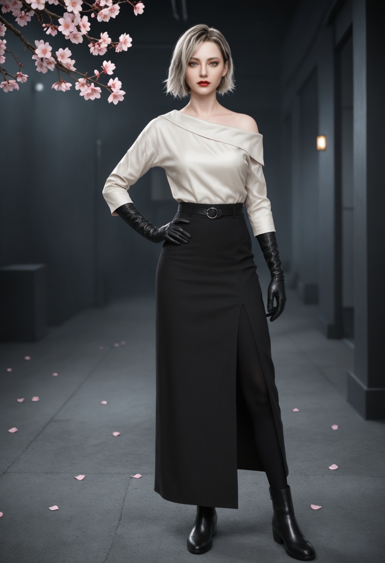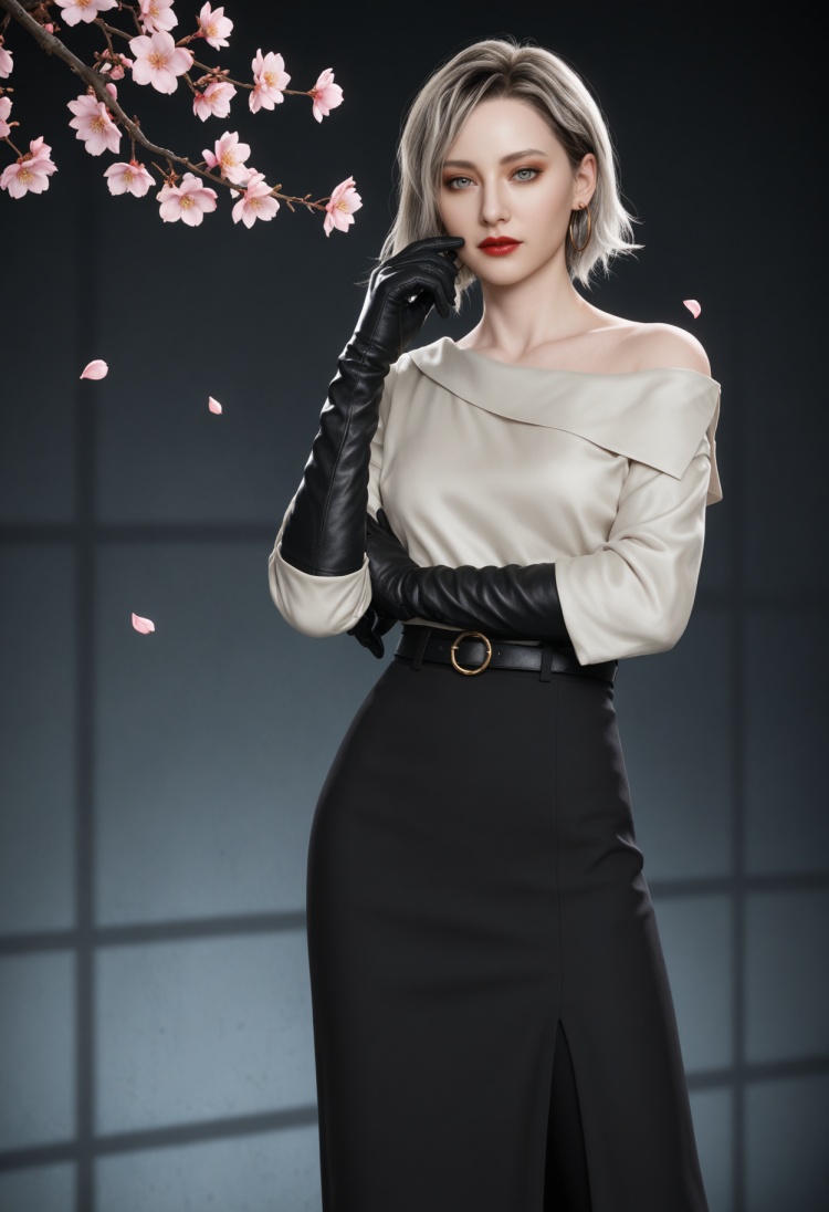 q1528437228,solo,1girl,short hair,shirt,earrings,jewelry,blonde hair,gloves,black gloves,white shirt,grey eyes,hoop earrings,skirt,grey hair,red lips,black skirt,belt,long sleeves,long skirt,brown eyes,pants,black footwear,black hair,boots,elbow gloves,lipstick,blue eyes,multicolored hair,off-shoulder shirt,