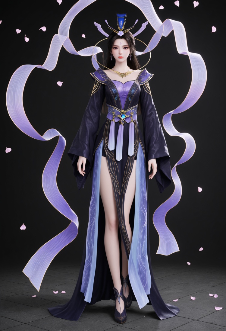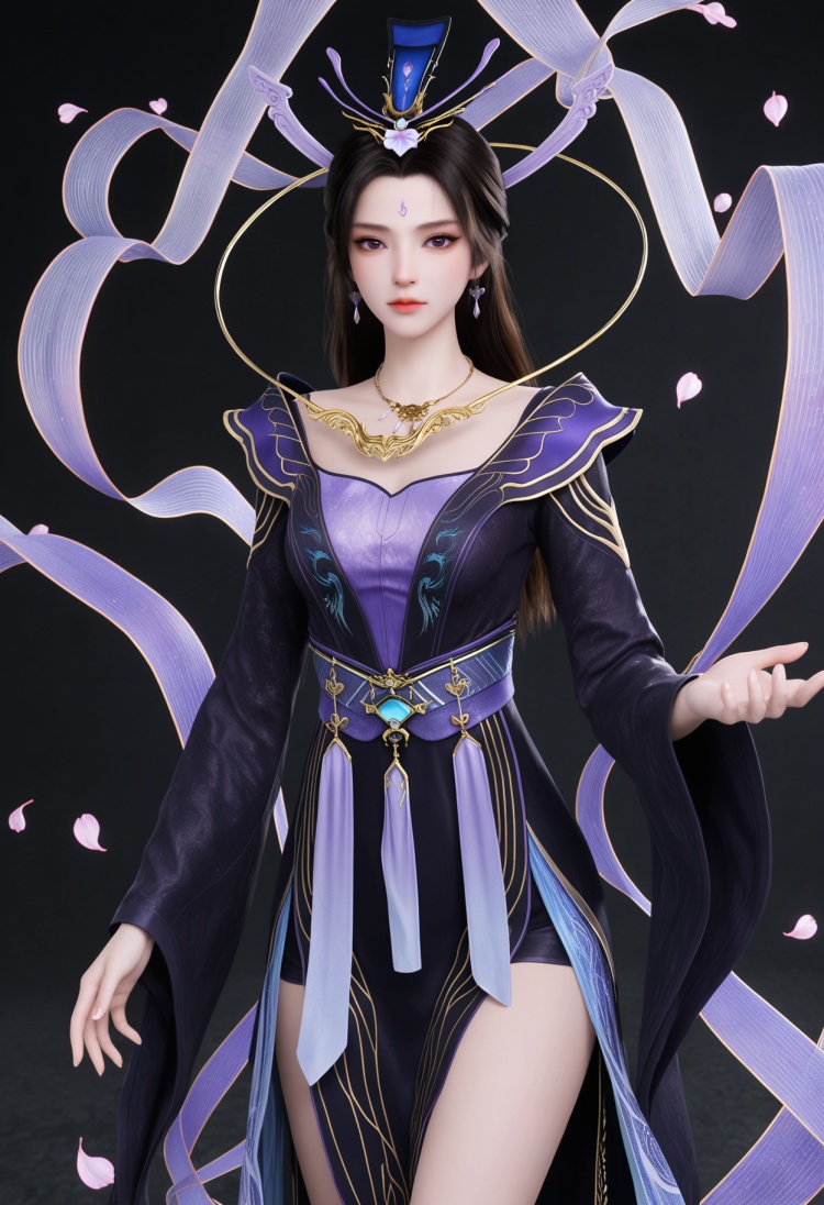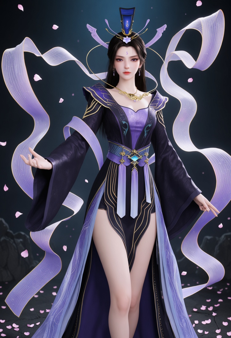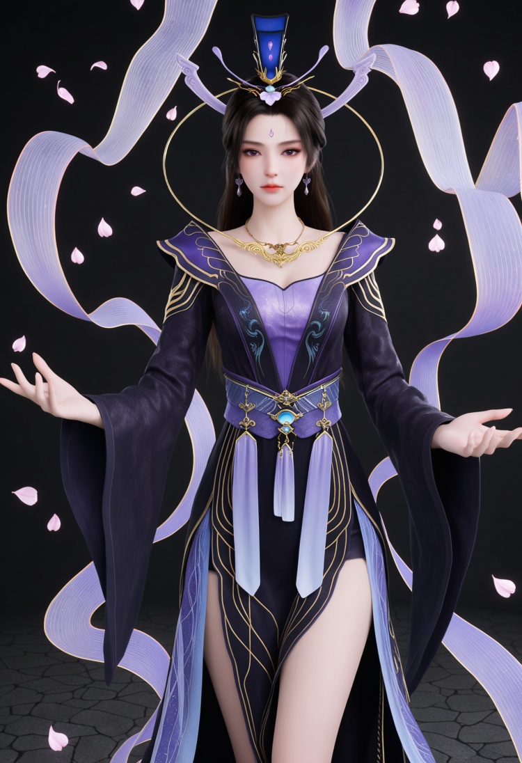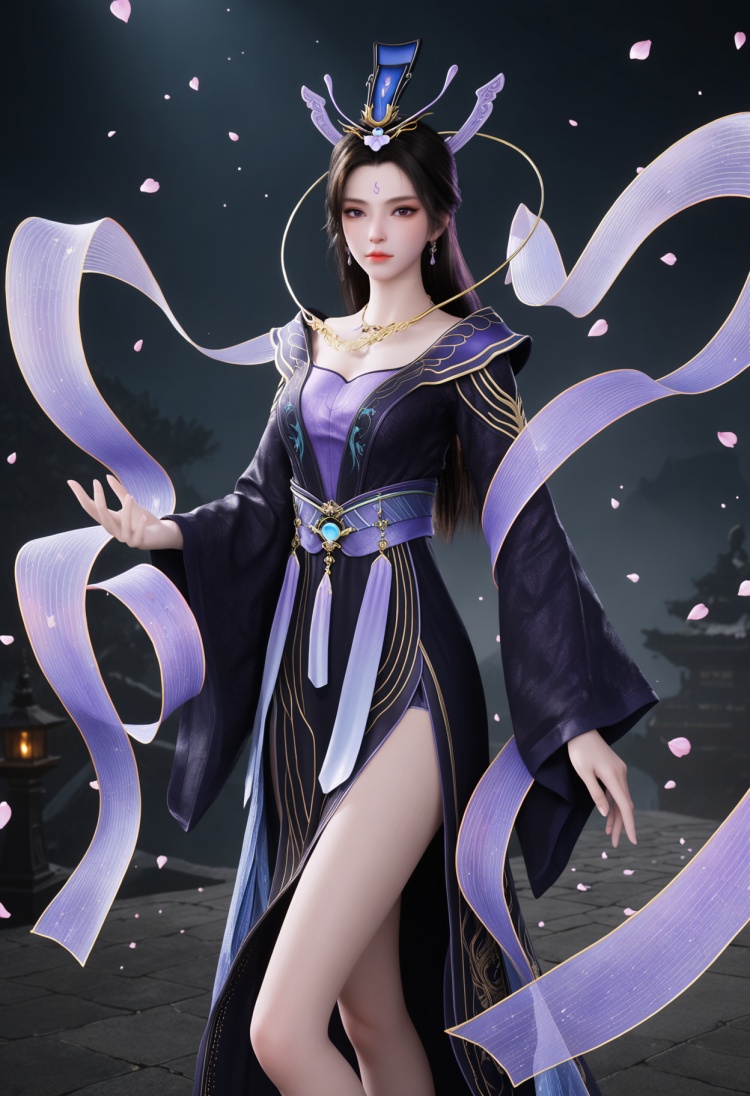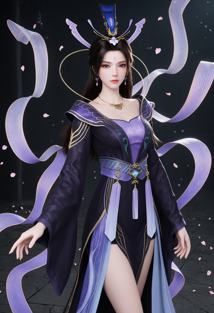 q1528437228,1girl,solo,black hair,long hair,jewelry,hair ornament,dress,earrings,necklace,Celestial streamers,Flowing streamer,Silk streamer,Trailing ribbon,ribbons,long sleeves,forehead mark,sash,chinese clothes,wide sleeves,purple dress,brown hair,shawl,hat,black footwear,black dress,purple eyes,floating,obi,hagoromo,bare legs,brown eyes,hair bun,side slit,