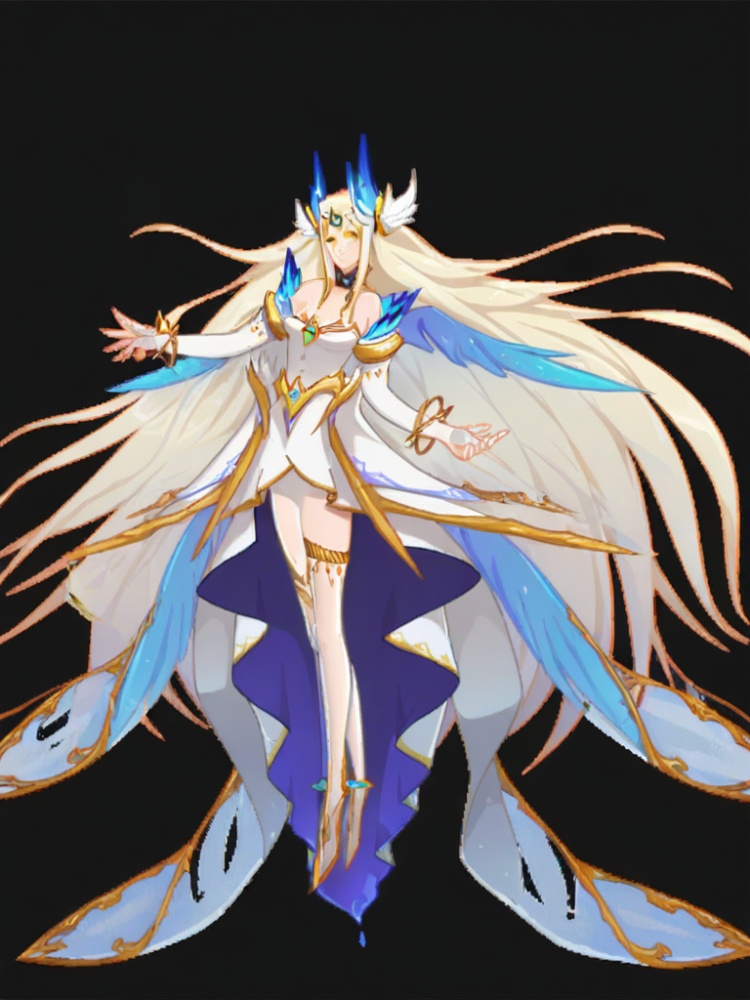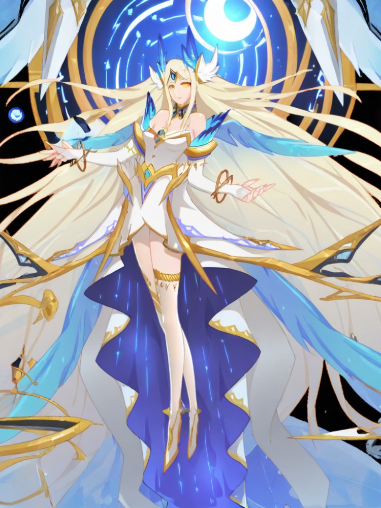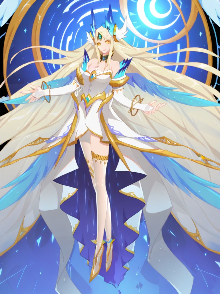 yinhe, 1girl, solo, long hair, blonde hair, cleavage, bare shoulders, jewelry, very long hair, full body, yellow eyes, white dress, bracelet, head wings, forehead jewel, gold trim, strapless, high low dress, multiple wings, blue feathered wings, choker, armlet, bridal gauntlets, blue wings, blue feathers, waist cape, hair ornament, armlet, thighlet, low wings,bangs,